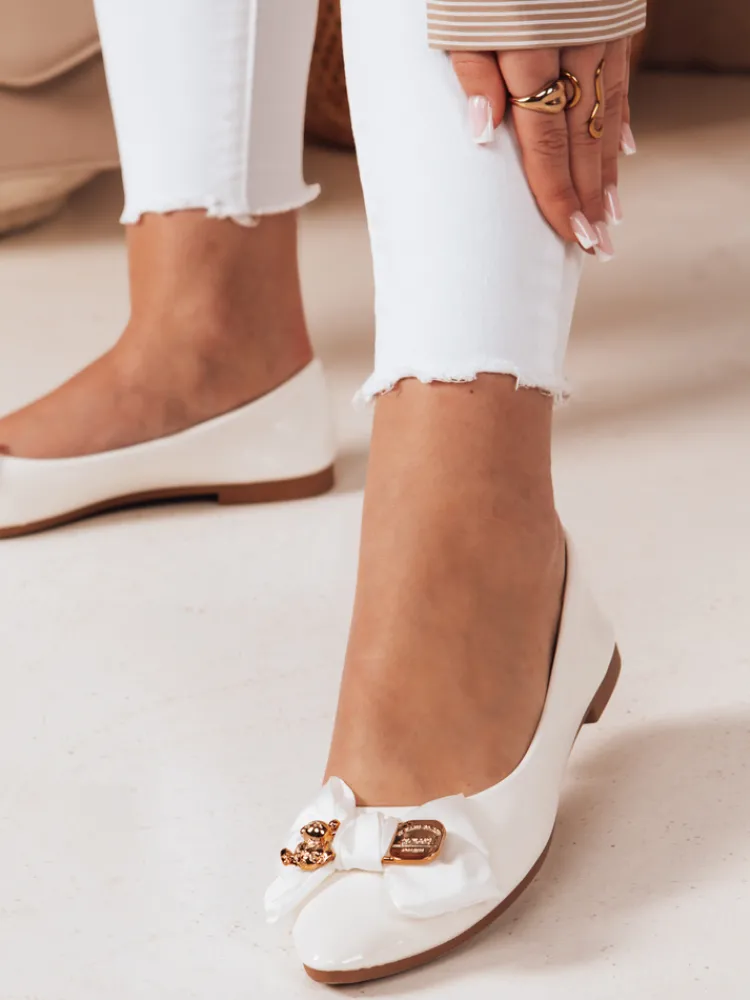 Balerinki damskie na płaskim obcasie. Wykonane z lakierowanej skóry ekologicznej. Wkładka zrobiona z eko skóry. Model posiada okrągły nosek oraz ozdobną kokardkę z misiem. Doskonale komponują się zarówno z jeansami, jak i sukienkami, tworząc pełen wdzięku look.