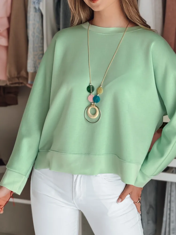Luźna bluzka oversize z długim rękawem, zakończona ściągaczami dla komfortowego dopasowania. Krótki fason świetnie komponuje się z wysokim stanem spodni i spódnic. Uniwersalny rozmiar pasuje od XS do L. W komplecie znajduje się wisiorek, który doskonale uzupełnia casualowe i eleganckie stylizacje. Modny, minimalistyczny design podkreśla nowoczesny charakter outfitu, idealna na różne okazji.