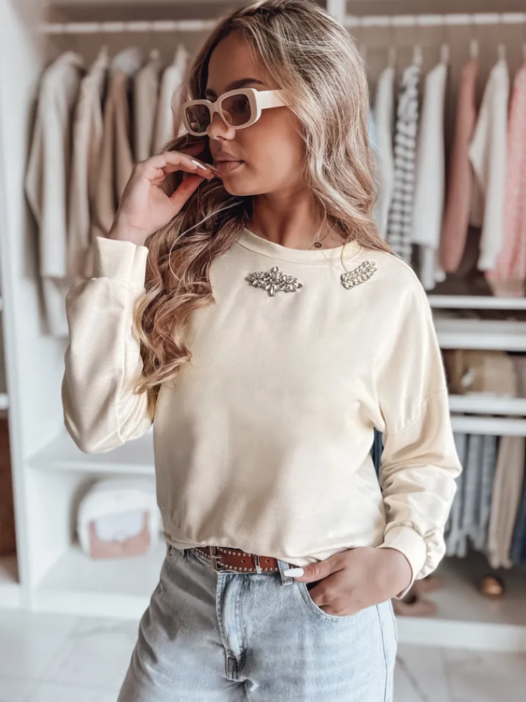 Nowoczesna bluzka z długim rękawem, która łączy wygodę z elegancją. Model o luźnym kroju, wykończony błyszczącymi cyrkoniami na dekolcie, dodaje subtelnego blasku każdej stylizacji. Krótsza długość sprawia, że doskonale pasuje do spodni z wysokim stanem. Ściągacze na dole i rękawach zapewniają świetne dopasowanie. Idealny wybór do wielu modnych oraz eleganckich stylizacji.