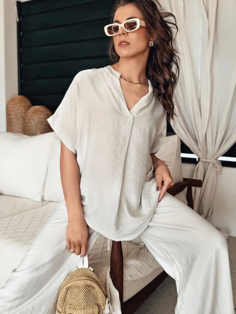 Wybierz bluzkę NAMAYAS i dodaj swojej garderobie nutkę nonszalancji. Zmysłowy dekolt w serek subtelnie podkreśla szyję, a krótkie rękawy zapewniają lekkość i swobodę. Ta bluzka to klucz do stworzenia wyjątkowych zestawów – doskonale współgra ze spodniami NAMAYAS, tworząc harmonijną całość.