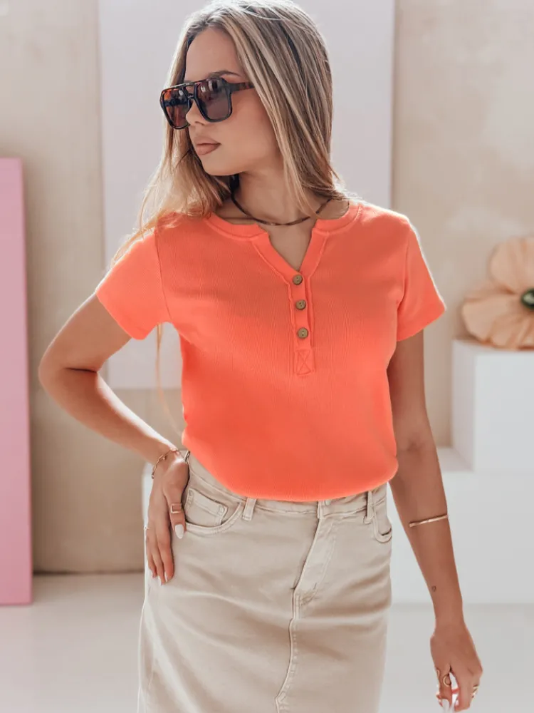 Bluzka damska z krótkim rękawem i dekoracyjnym rozpinanym dekoltem to połączenie stylu oraz wygody. Uszyta z elastycznego, prążkowanego materiału, zapewnia komfort noszenia przez cały dzień. Guziki z przodu tworzą modny akcent, który świetnie podkręca klasyczne stylizacje. Uniwersalny rozmiar pasuje od XS do L. Model idealny na wiosnę i lato, świetnie wygląda z jeansami lub spódnicami.