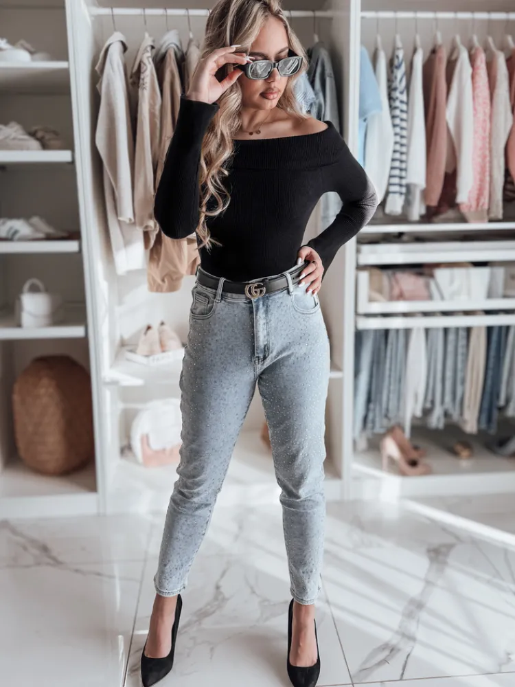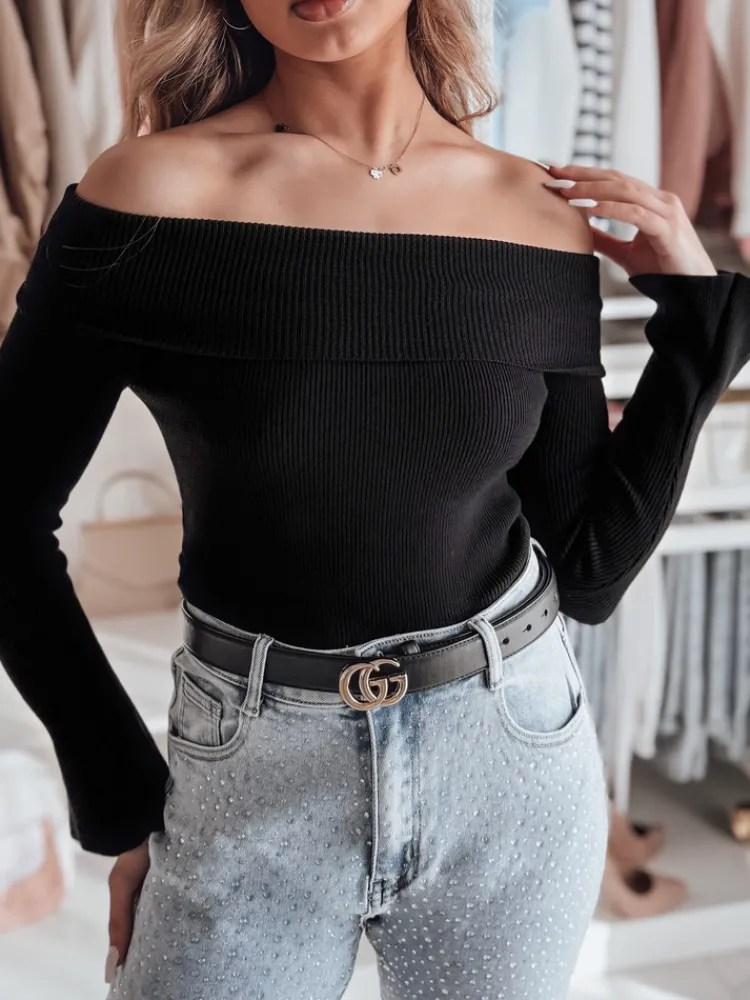 Bluzka z dekoltem off-shoulder, który pięknie eksponuje ramiona. Dopasowany krój podkreśla sylwetkę, a szerokie rękawy dodają elegancji. Przyjemny w dotyku materiał sprawia, że noszenie go to czysta przyjemność. Doskonale sprawdzi się w połączeniu z jeansami lub ołówkową spódnicą.