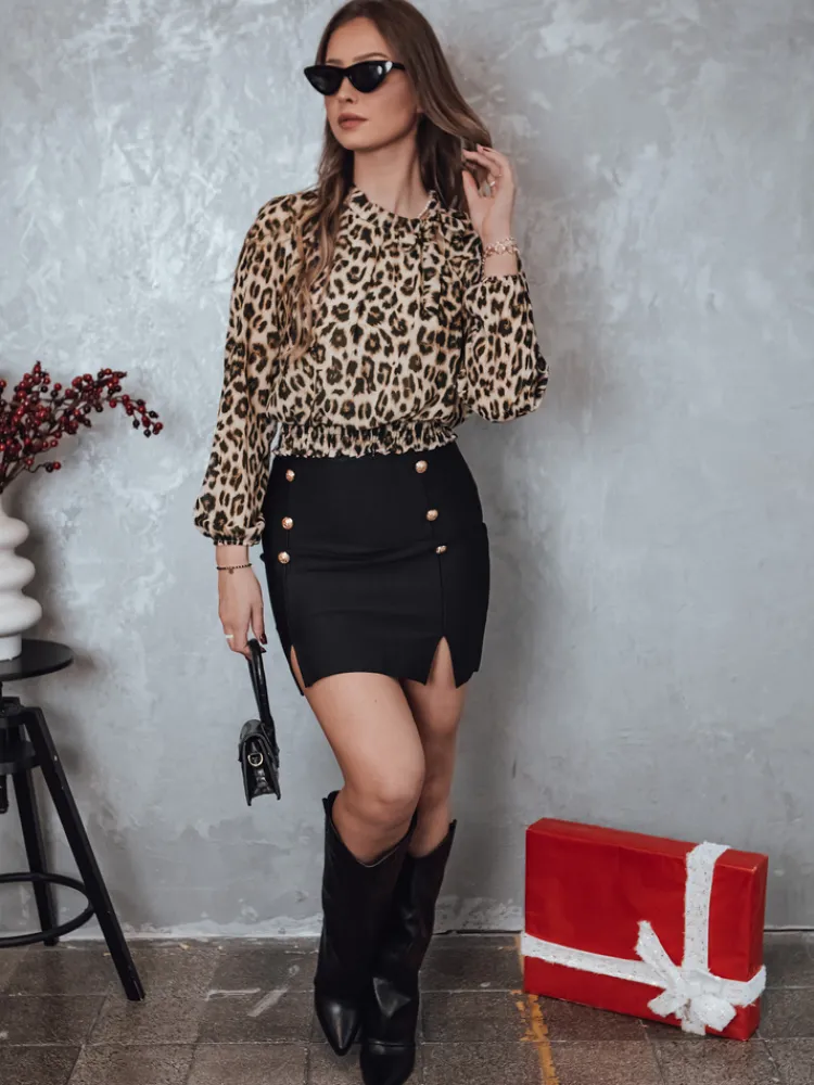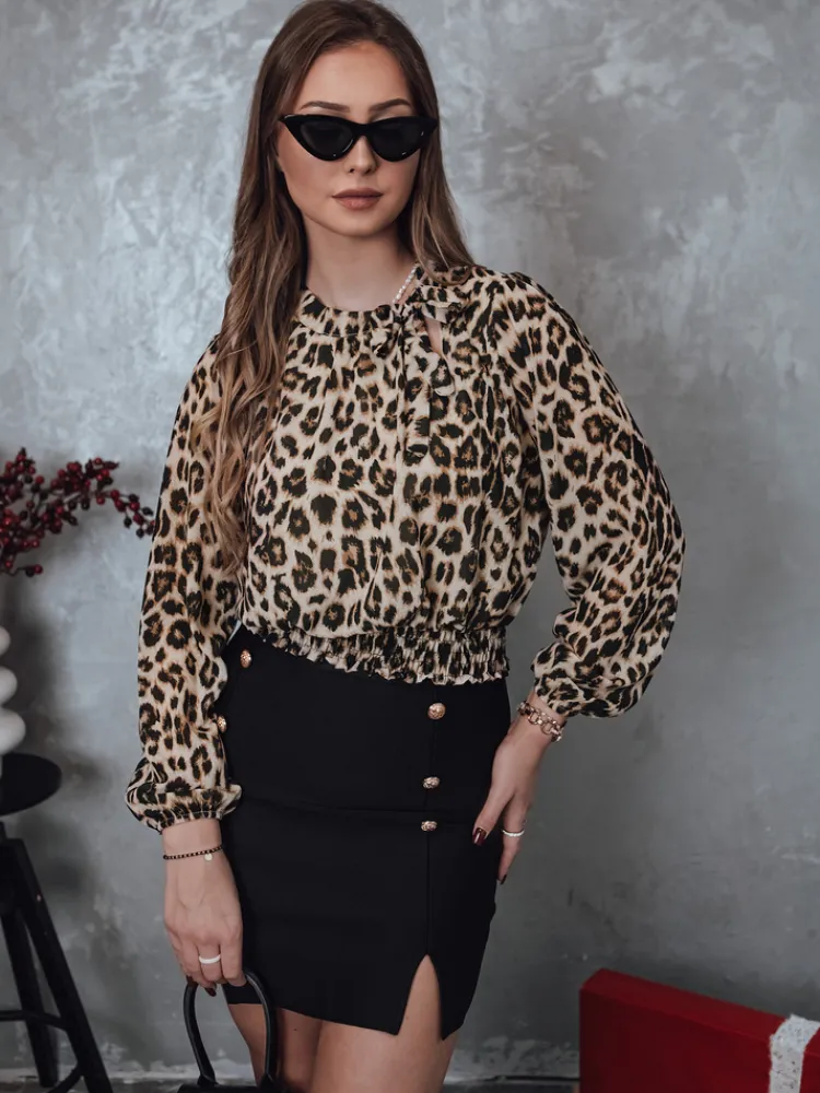 Bluzka o drapieżnym wzorze inspirowanym naturą to wybór dla kobiet pewnych siebie, które chcą wyróżniać się w tłumie. Wygodny krój oraz starannie dobrany materiał sprawiają, że bluzka idealnie nadaje się zarówno na wieczorne wyjścia, jak i codzienne stylizacje. Dzięki detalom i subtelnemu marszczeniu przy dekolcie, dodaje każdej stylizacji charakteru i elegancji.