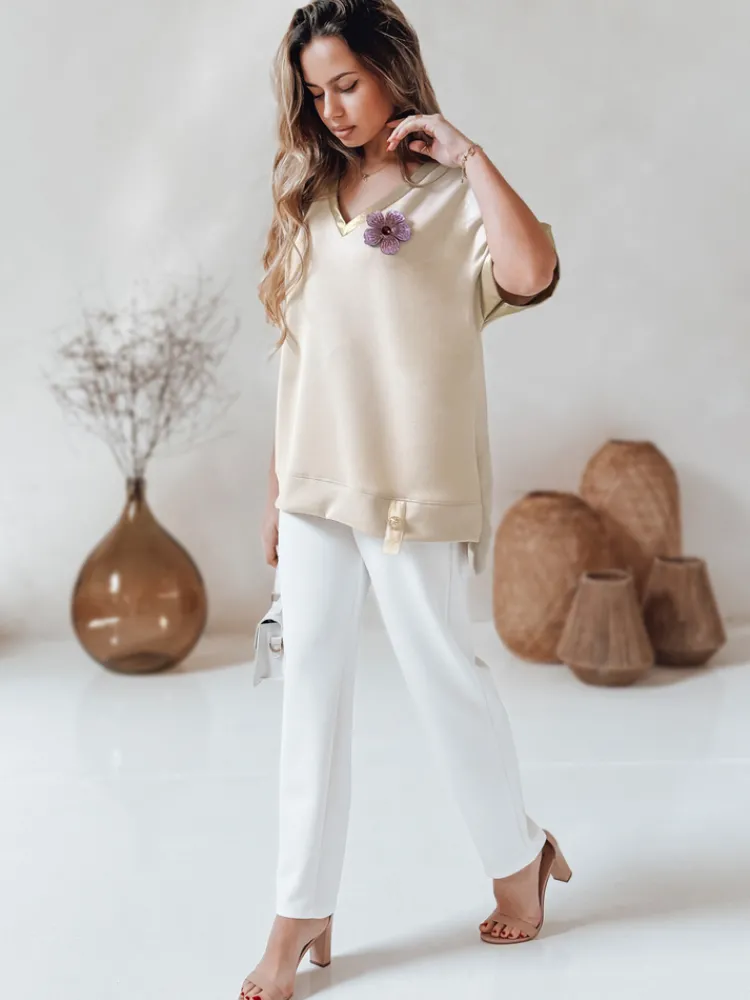 Bluzka damska oversize w stylu casualowym z efektownym wykończeniem to idealna baza dla wielu wiosennych stylizacji. Uniwersalny rozmiar pasuje od XS do L. Dekolt w serek pięknie eksponuje szyję, a rękawy zakończone ozdobnymi paskami dodają szyku. Model zdobi kwiatowy motyw z cyrkonii na piersi oraz mały guzik wszyty na dole. Dłuższy tył świetnie komponuje się zarówno ze spodniami typu slim fit, jak i spódnicami.