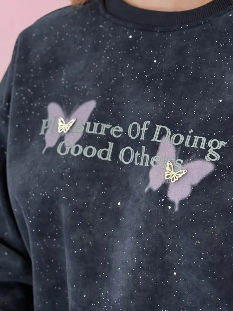 Damska bluza oversize z motywem tie-dye to idealne połączenie wygody i stylu. Ozdobny nadruk z motylkami oraz brokatowe wstawki na całości bluzy nadają jej subtelnego, kobiecego charakteru. Efekt 3D uzyskany dzięki naszywanym motylom sprawia, że bluza prezentuje się niezwykle modnie. Uniwersalny rozmiar pasuje od XS do L. To idealna propozycja dla miłośniczek casualowych stylizacji, doskonale komponuje się z jeansami, jak i legginsami, tworząc stylowy look na co dzień.