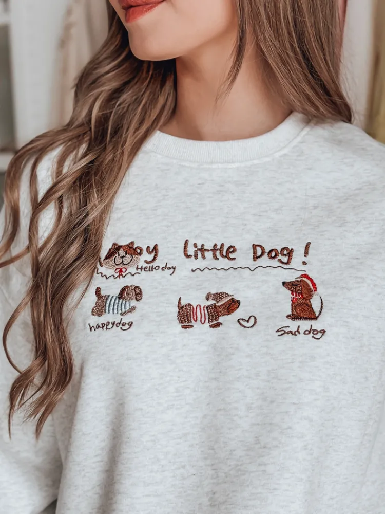 Damska bluza oversize z haftowanym nadrukiem jamników i napisem „Happy Little Dog” to połączenie komfortu i uroku. Uniwersalny rozmiar pasuje od XS do L. Model wkładany przez głowę, wykończony ściągaczami przy rękawach i dole. Okrągły dekolt oraz miękki, przyjemny w dotyku materiał zapewniają wygodę przez cały dzień. Idealna propozycja na wiosnę dla miłośniczek luźnych, casualowych stylizacji z odrobiną humoru.
