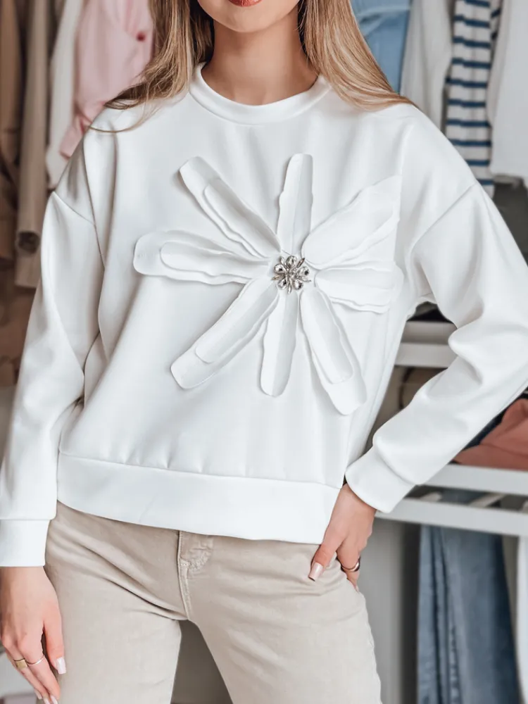 Bluza damska w kroju oversize, wyróżniająca się przestrzenną aplikacją w kształcie kwiatu z połyskującymi cyrkoniami. Uniwersalny rozmiar pasuje od XS do L. Minimalistyczny design łączy się z efektownymi detalami, tworząc nietuzinkowy element garderoby. Świetna do jeansów i spodni materiałowych.