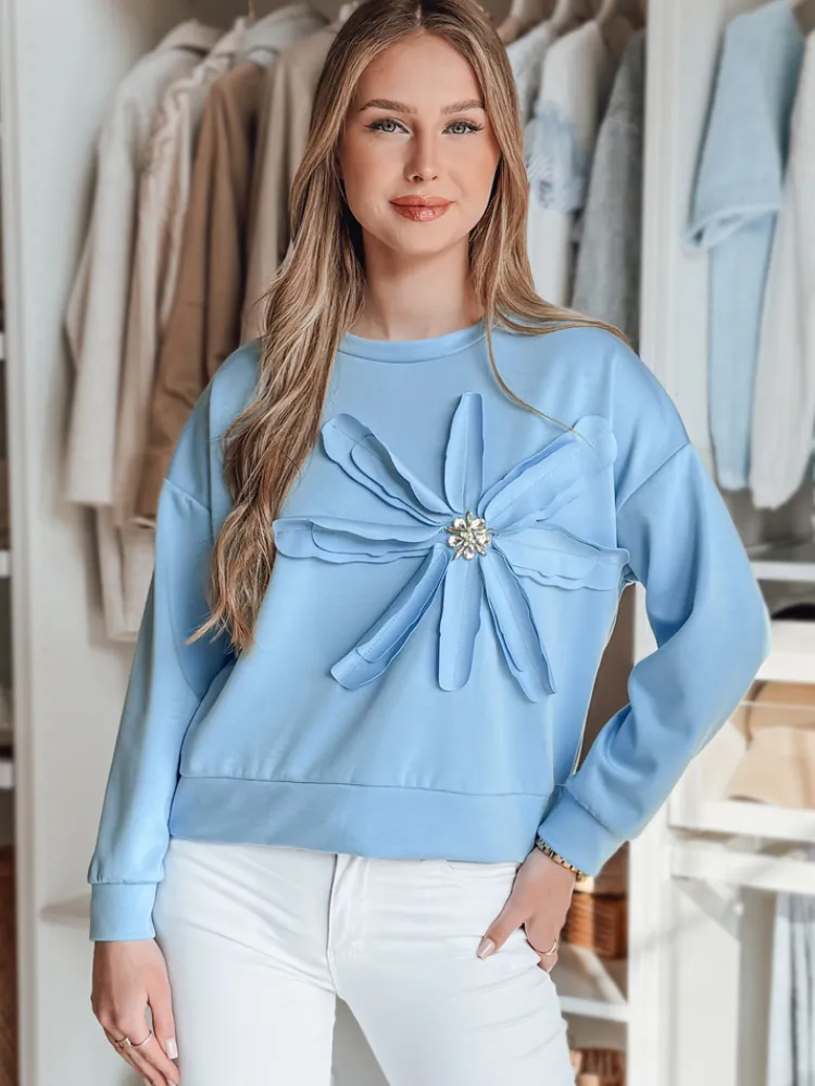 Bluza damska w kroju oversize, wyróżniająca się przestrzenną aplikacją w kształcie kwiatu z połyskującymi cyrkoniami. Uniwersalny rozmiar pasuje od XS do L. Minimalistyczny design łączy się z efektownymi detalami, tworząc nietuzinkowy element garderoby. Świetna do jeansów i spodni materiałowych.