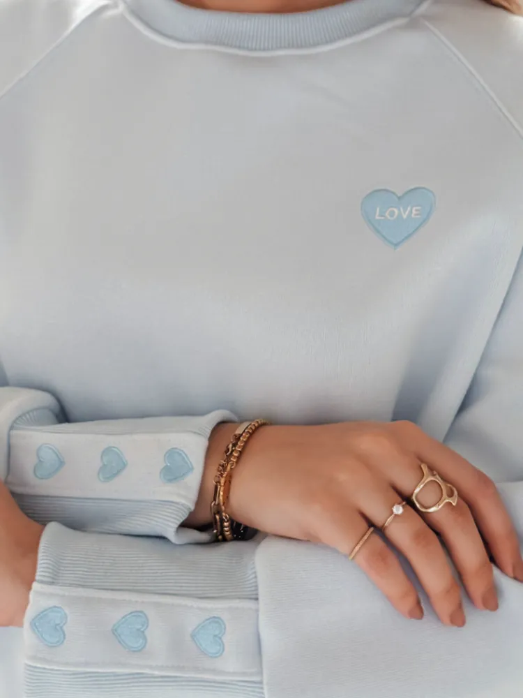Oversize’owa bluza damska z dekoracyjnym haftem serca i napisem „LOVE” na piersi oraz uroczymi serduszkami na rękawach. Model wkładany przez głowę, bez kaptura, z okrągłym dekoltem i ściągaczami. Uniwersalny rozmiar pasuje od XS do L. Miękki materiał zapewnia komfort noszenia. Idealna propozycja na wiosenne stylizacje.