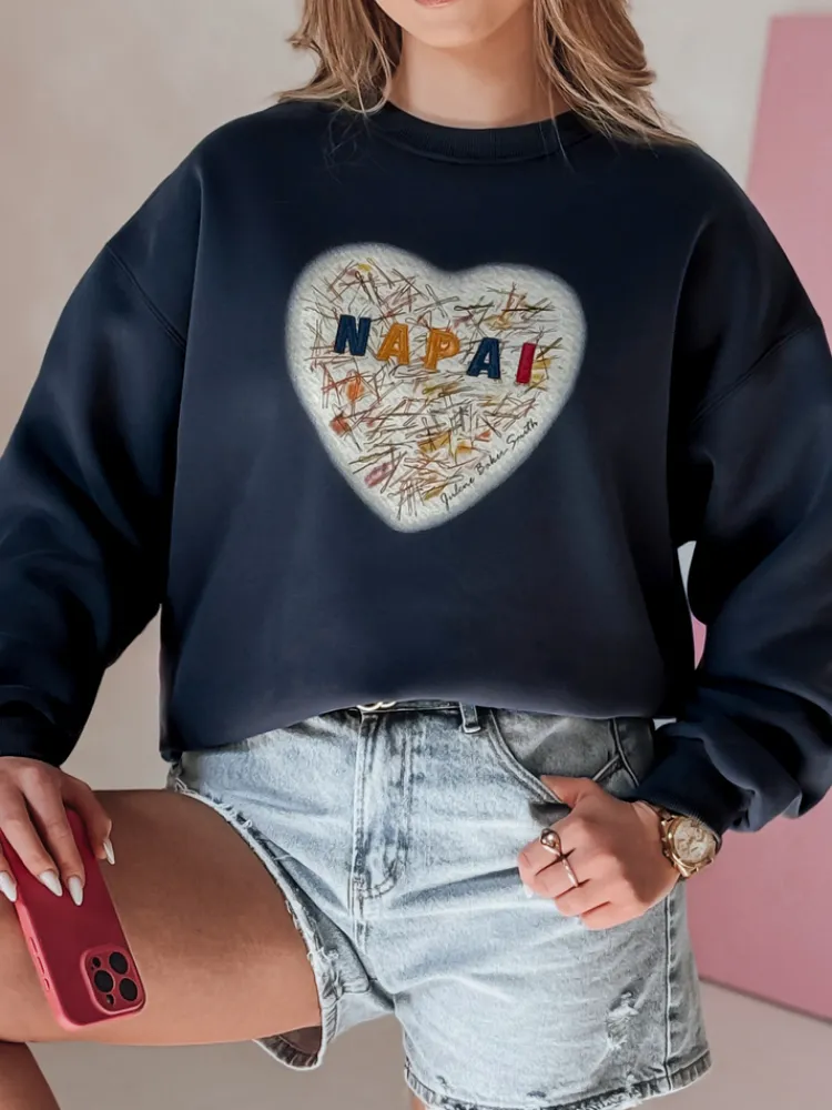 Bluza damska oversize z nadrukiem w kształcie serca i haftowanym napisem to połączenie modnego designu z wygodą. Wzór z wsuwkami w sercu tworzy ciekawy efekt graficzny, który wyróżnia się na tle codziennych stylizacji. Ściągacze przy rękawach i na dole dodają stylu i dbają o dobre dopasowanie.Uniwersalny rozmiar pasuje od XS do L. Bluza idealnie sprawdzi się na sezon wiosenny do casualowych stylizacji.