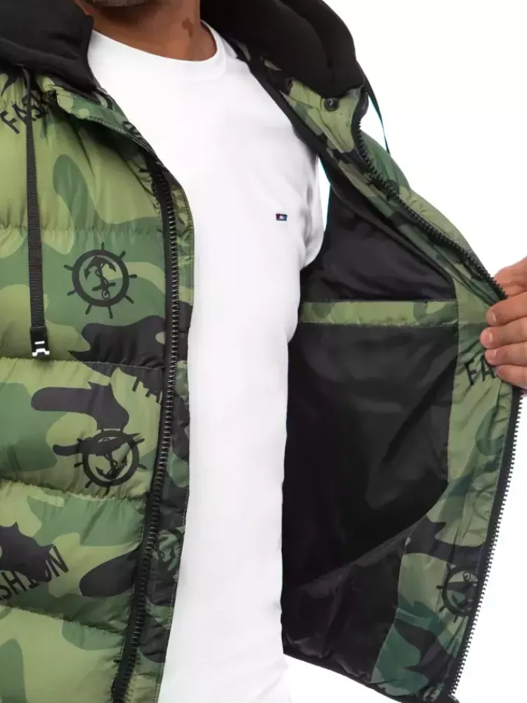 Kamizelka męska pikowana z kapturem.Zapinana na zamek błyskawiczny.Odpinany, materiałowy kaptur regulowany sznurkiem….
