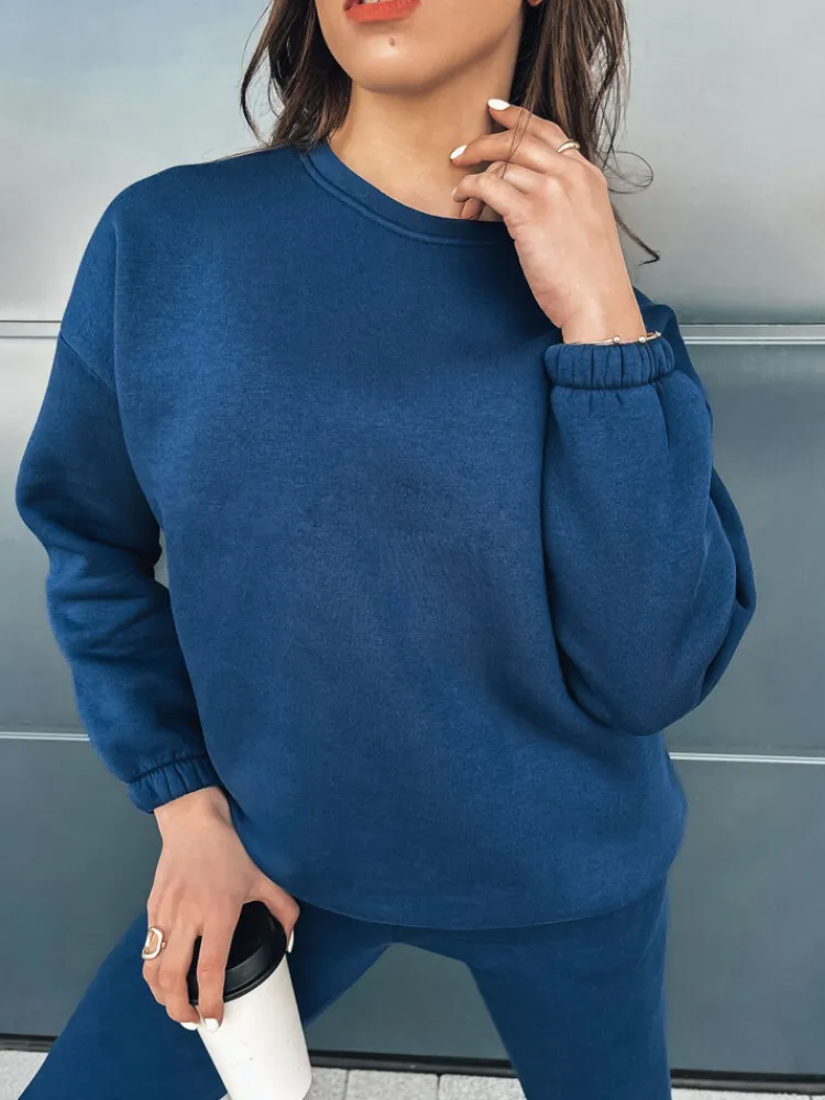 Basicowy lekko ocieplany komplet to HIT nadchodzącego sezonu. Bluza posiada ściągacze przy rękawach oraz na dole. Spodnie prócz gumki w pasie posiadają również sznureczki, dzięki czemu możemy dopasować je do naszej sylwetki. Komplet jest niezwykle miły w dotyku. Dostępny w kilkunastu wersjach kolorystycznych.