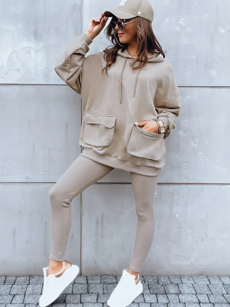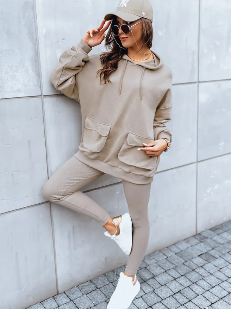 Komplet dresowy MATTHEW to niezbędnik w każdej szafie niezależnie od pory. Składający się z bluzy o kroju oversize oraz dopasowanych, prążkowanych legginsów set, zaprezentuje się świetnie zarówno w zestawie jak i osobno. Bluza posiada dwie duże kieszenie, stanowiące również element ozdobny, duży kaptur oraz złotą naszywkę na rękawie. Dostępny w trzech wersjach kolorystycznych.