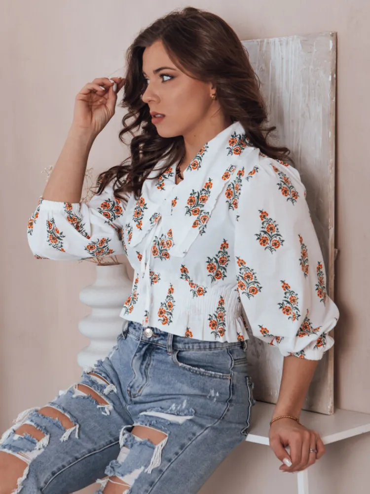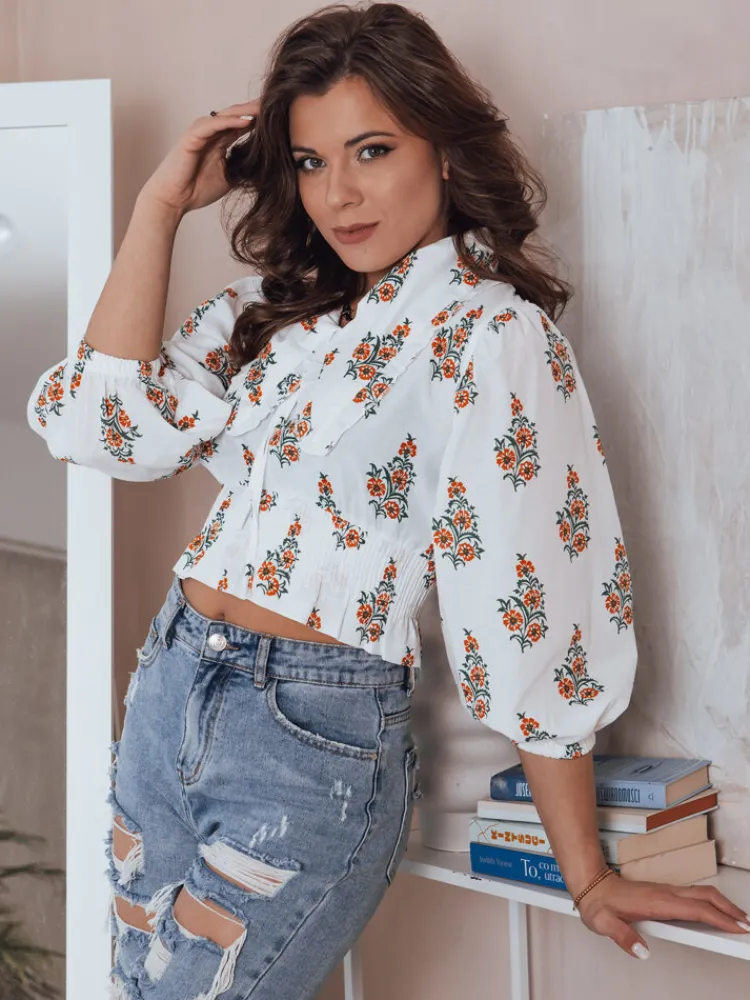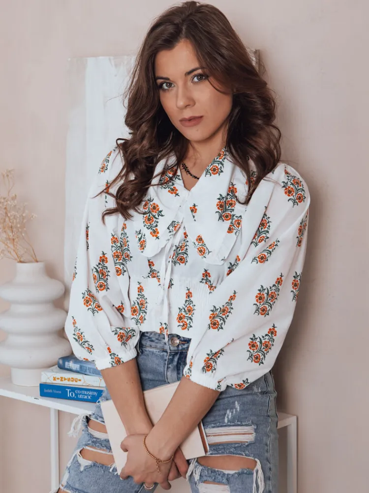 Elegancka bluzka, którą możesz złożyć zarówno do spodni, jak i do spódniczki lub szortów. Rękawy zakończone są gumeczką, dzięki czemu możesz regulować długość. Bluzka posiada ozdobny duży kołnierz. Dół zakończony jest dużym ściągaczem. Model posiada piękny, roślinny wzór.