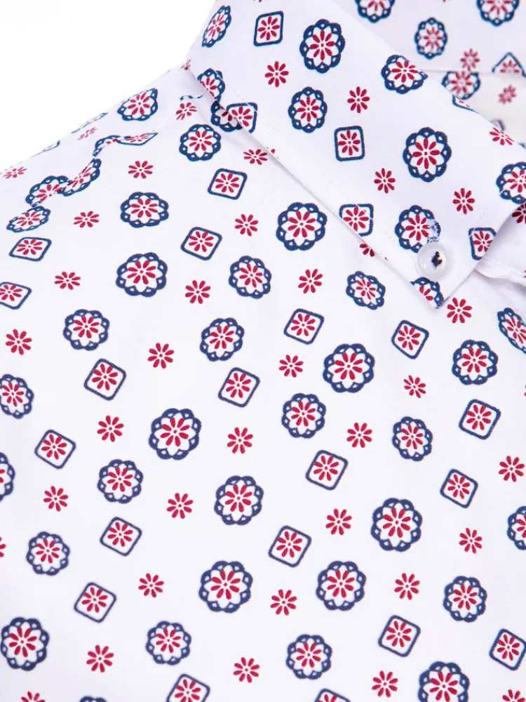 Rewelacyjna koszula męska we wzory.Z krótkim rękawem.Zapinana na guziki.Kołnierzyk button-down.Fason slim fit – lekk…