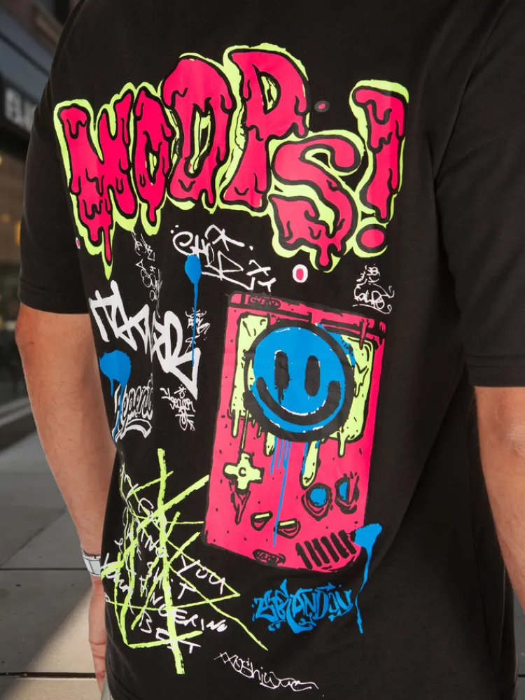 Męska koszulka t-shirt o luźnym kroju, idealna na co dzień i wpisująca się w miejski styl. Wyróżnia się kontrastowym nadrukiem z przodu oraz dużą grafiką graffiti na całych plecach, która przyciąga wzrok oraz nadaje streetwearowego charakteru. Klasyczny, okrągły dekolt zapewnia wygodę, a przewiewny materiał sprawia, że model świetnie sprawdza się w sezonie wiosennym.