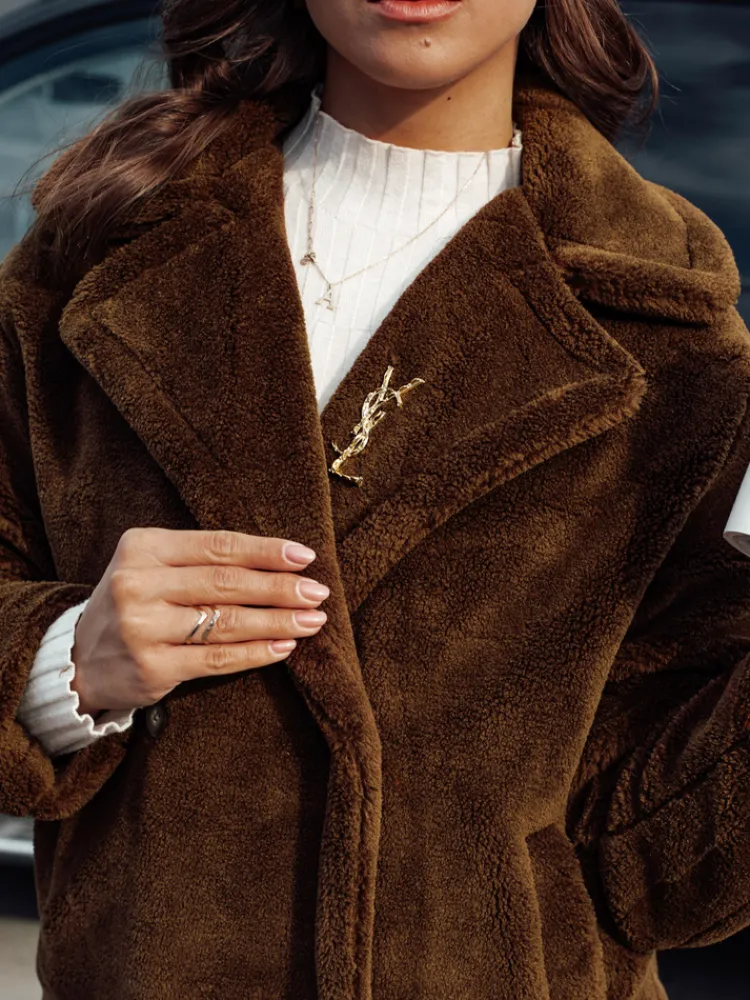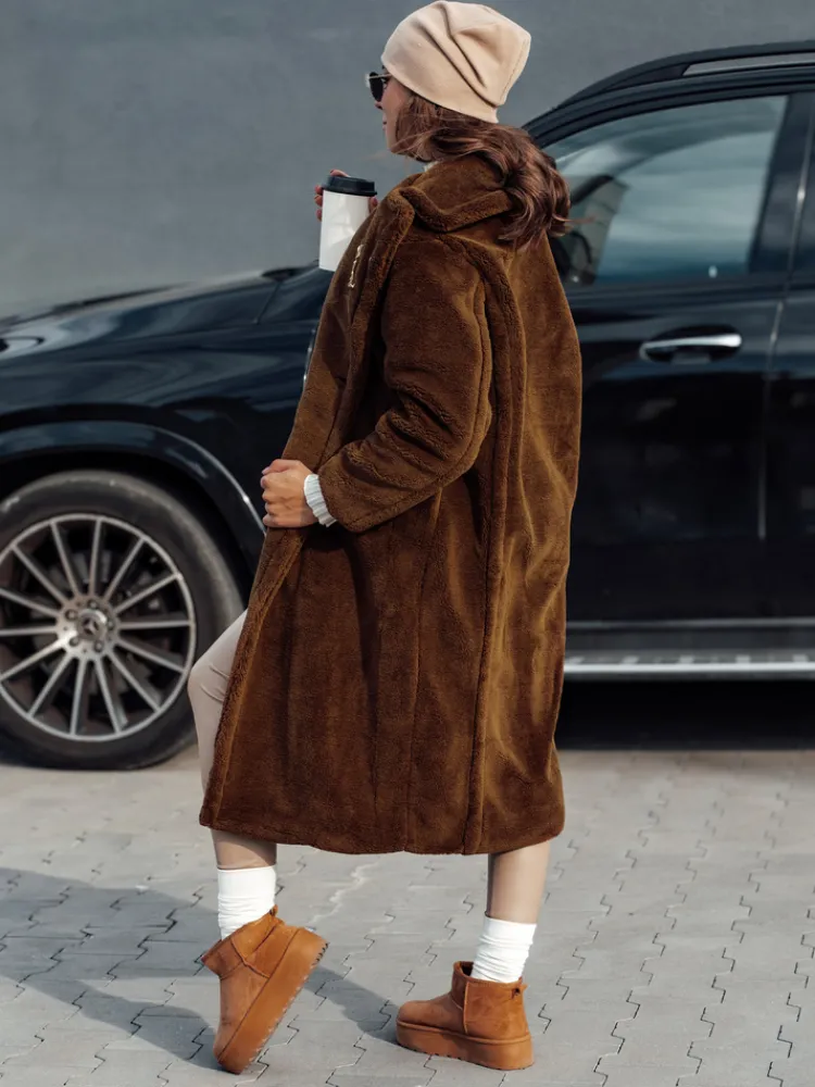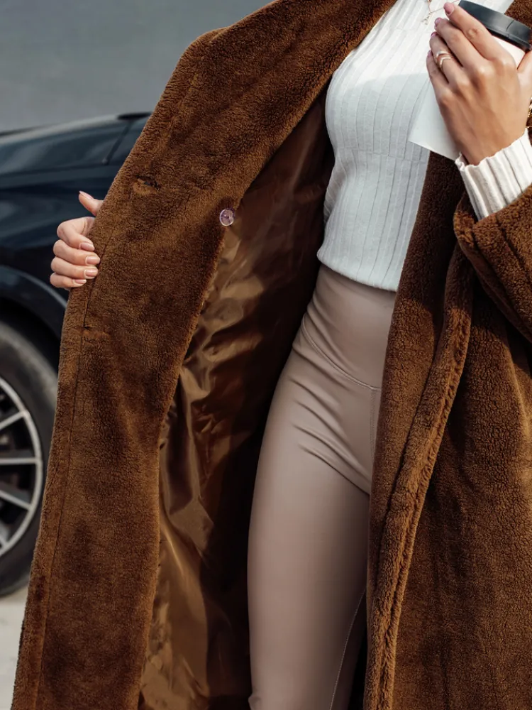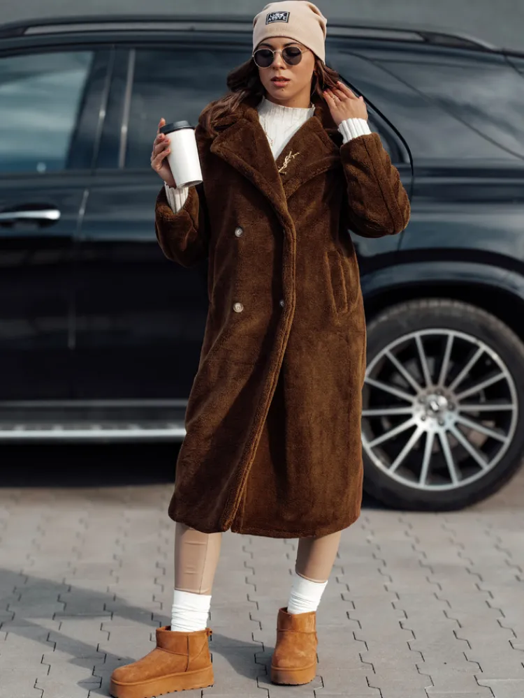 Płaszcz o nowoczesnym kroju, który łączy klasyczną elegancję z nowoczesnym stylem. Miękki materiał zapewnia komfort noszenia, a jego uniwersalny wygląd sprawia, że pasuje do każdej okazji. Świetnie sprawdzi się w codziennych stylizacjach, ale także jako dopełnienie bardziej wyszukanych zestawów. Idealny wybór na sezon jesienno-zimowy dla kobiet ceniących sobie modę i wygodę.