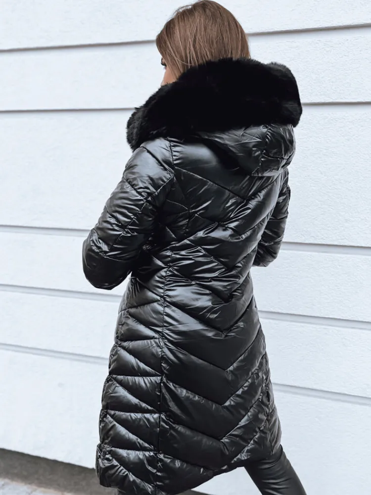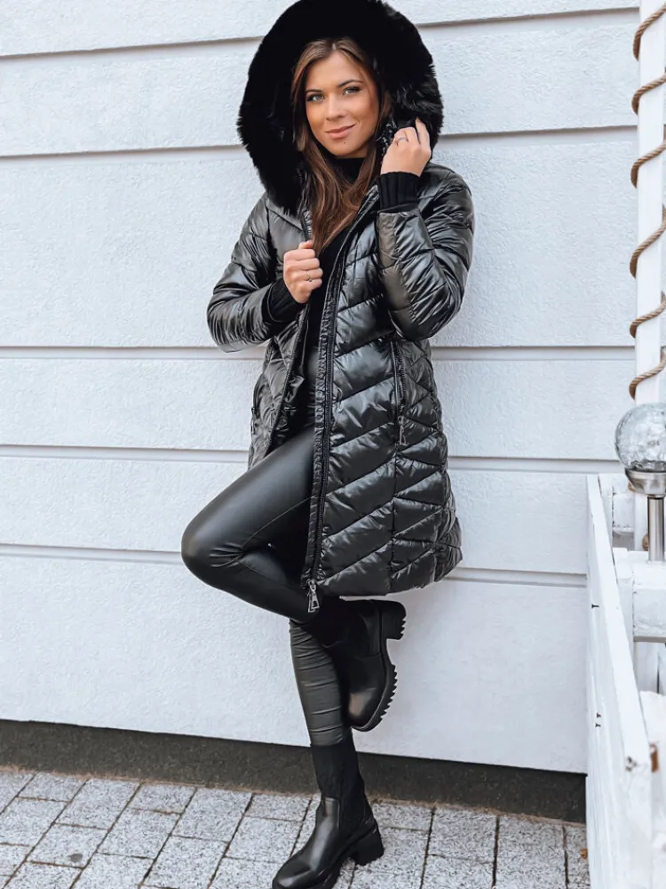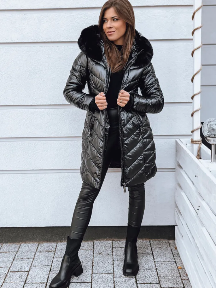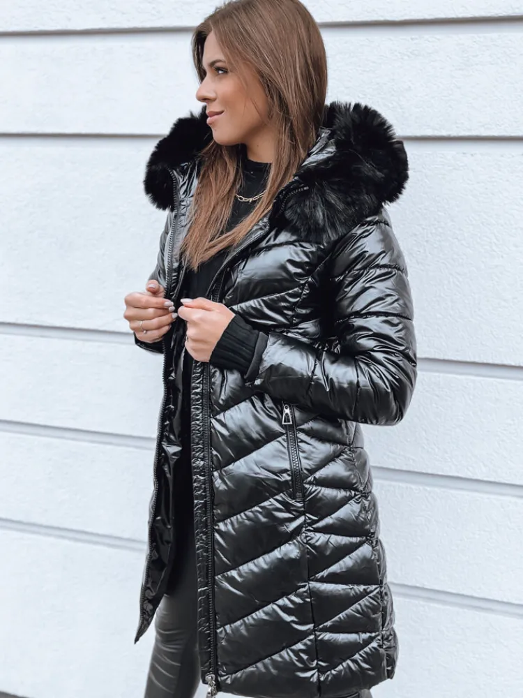 Wyjątkowa pikowana kurtka wykonana z połyskującego materiału. Model posiada nieodpinany kaptur z odpinany futerkiem. Z przodu znajdują się dwie pojemne kieszenie. Całość prezentuje się niezwykle stylowo i modne. Doskonale sprawdzi się zarówno w eleganckich jak i sportowych stylizacjach.