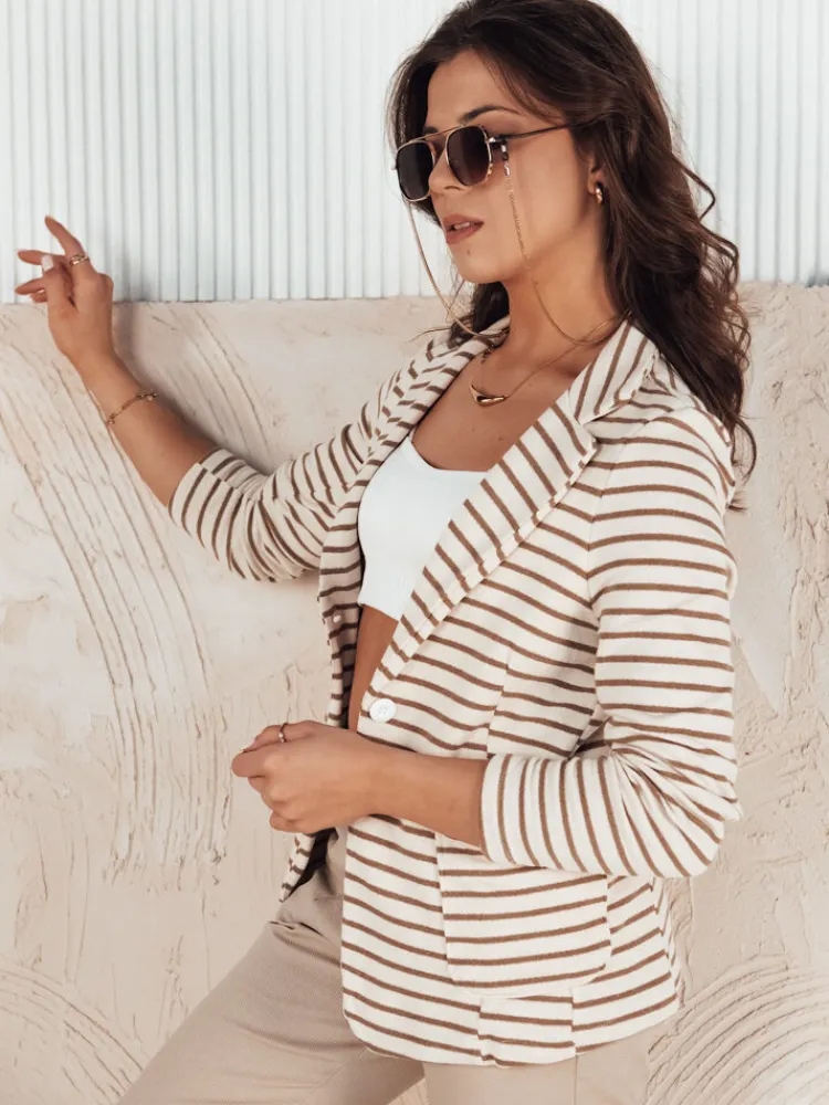 Marynarka COLLIN to elegancka interpretacja klasycznego stylu, idealna dla nowoczesnych kobiet ceniących sobie wyrafinowaną prostotę z modnym akcentem. Design z poziomymi paskami nadaje jej lekkości i świeżości, podczas gdy klasyczny kołnierz i funkcjonalne kieszenie zachowują tradycyjną elegancję. Doskonale sprawdzi się jako wykończenie zarówno biznesowych, jak i casualowych zestawów.