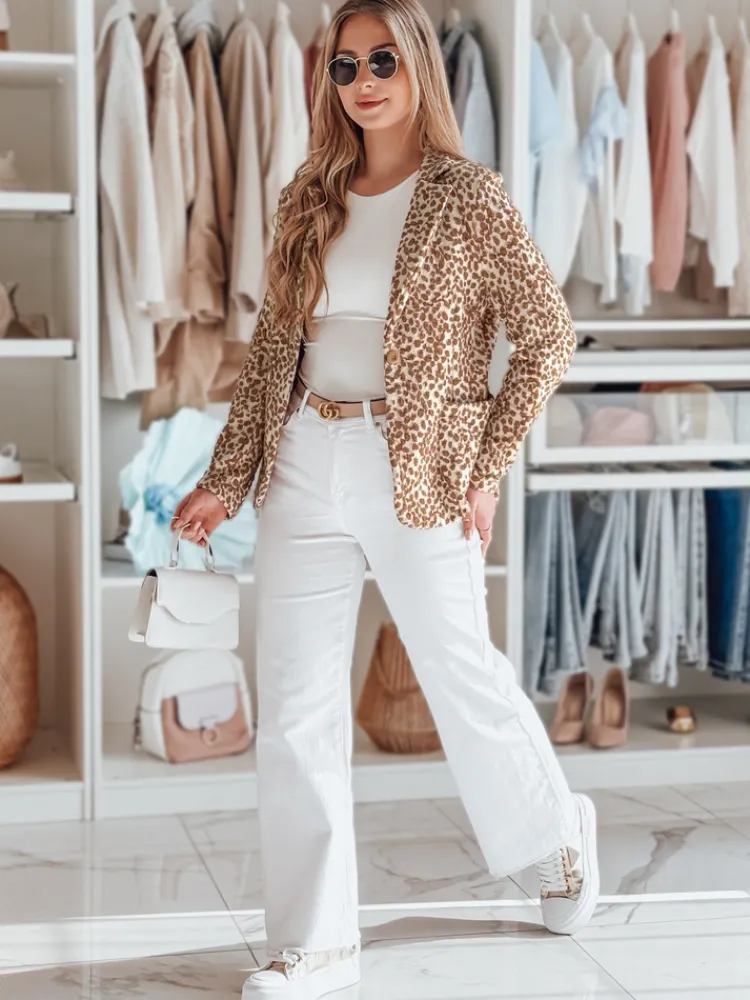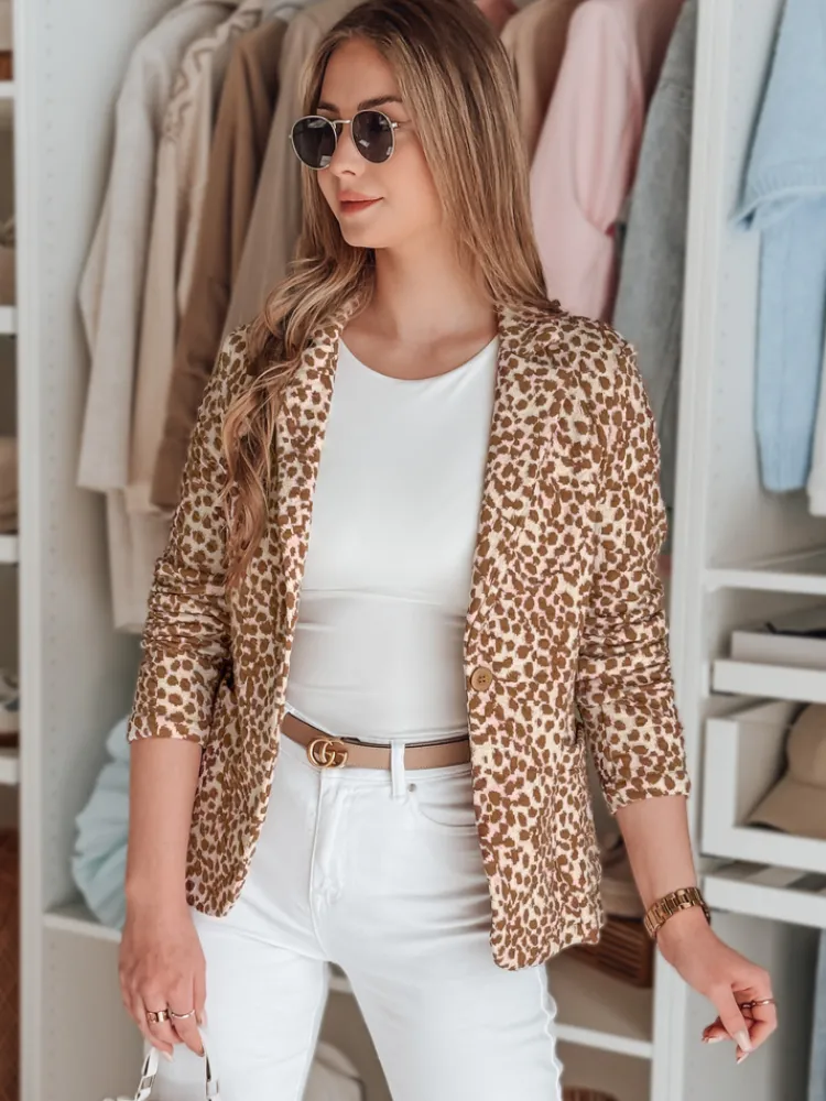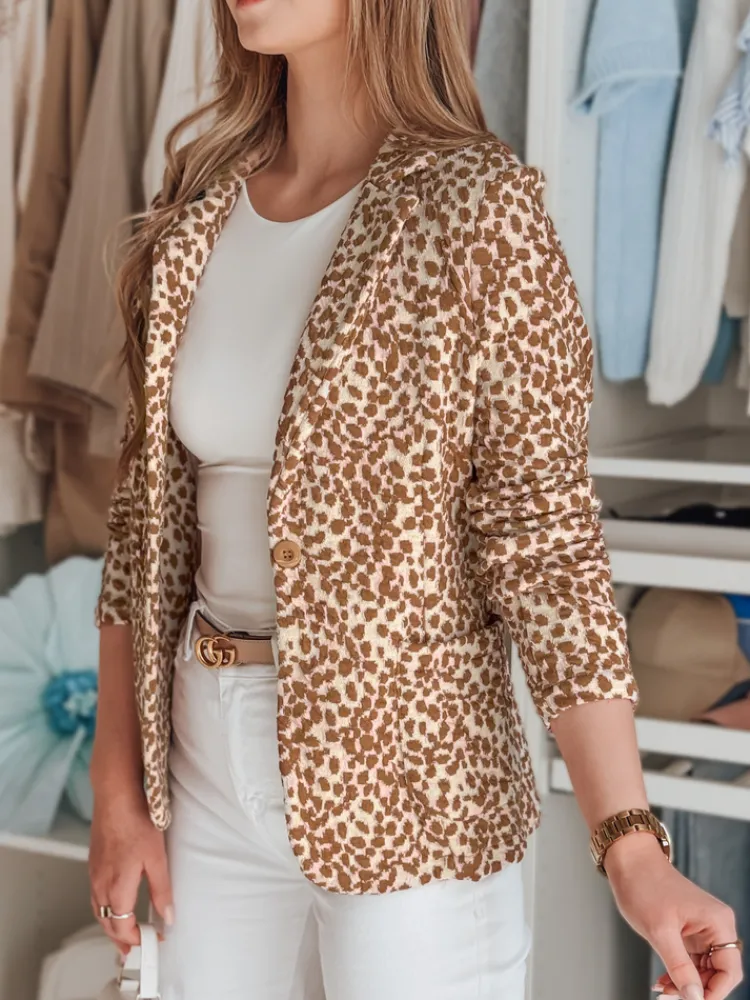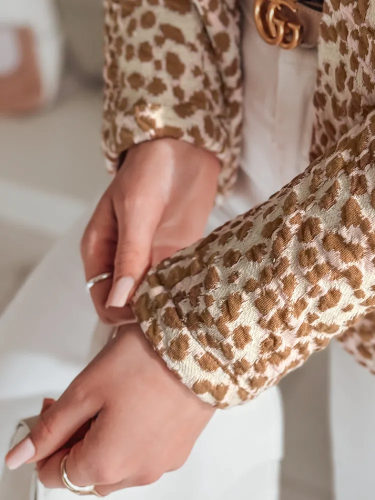Taliowana marynarka o kobiecym fasonie. Model zapinany na guzik, z dwiema ozdobnymi kieszeniami. Długość do bioder zapewnia uniwersalność, a długi rękaw dodaje elegancji. Wzór inspirowany zwierzęcym printem nadaje jej charakteru. Przyjemny bawełniany materiał sprawia, że to idealny wybór do casualowych stylizacji. Świetnie współgra z dopasowanymi spodniami oraz zwiewnymi sukienkami.