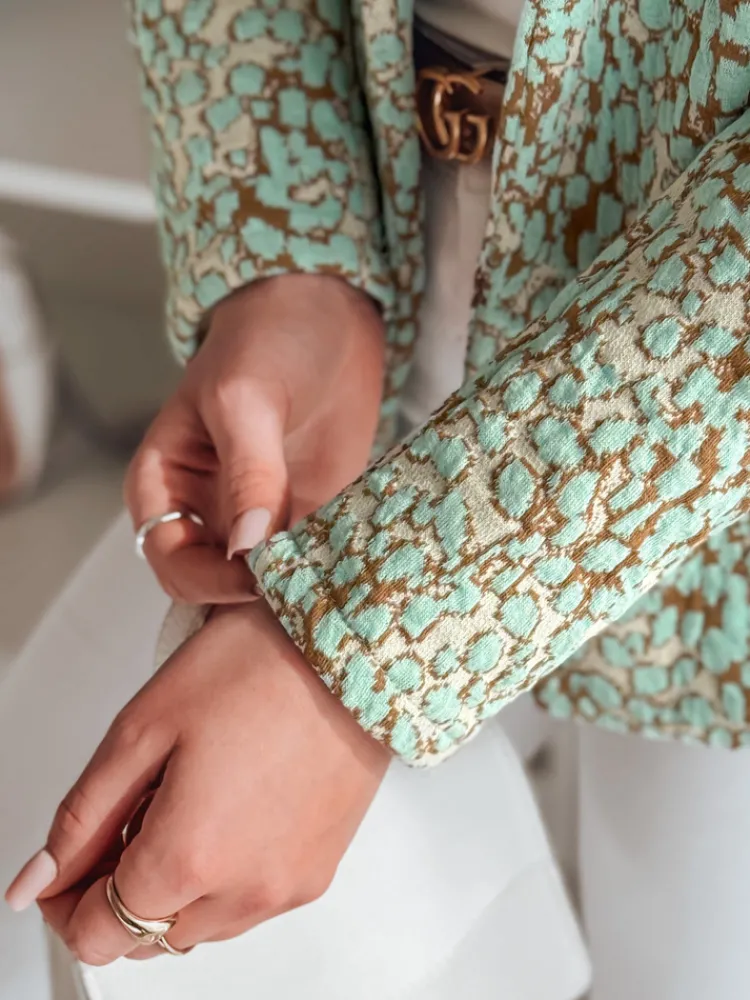 Taliowana marynarka o kobiecym fasonie. Model zapinany na guzik, z dwiema ozdobnymi kieszeniami. Długość do bioder zapewnia uniwersalność, a długi rękaw dodaje elegancji. Wzór inspirowany zwierzęcym printem nadaje jej charakteru. Przyjemny bawełniany materiał sprawia, że to idealny wybór do casualowych stylizacji. Świetnie współgra z dopasowanymi spodniami oraz zwiewnymi sukienkami.