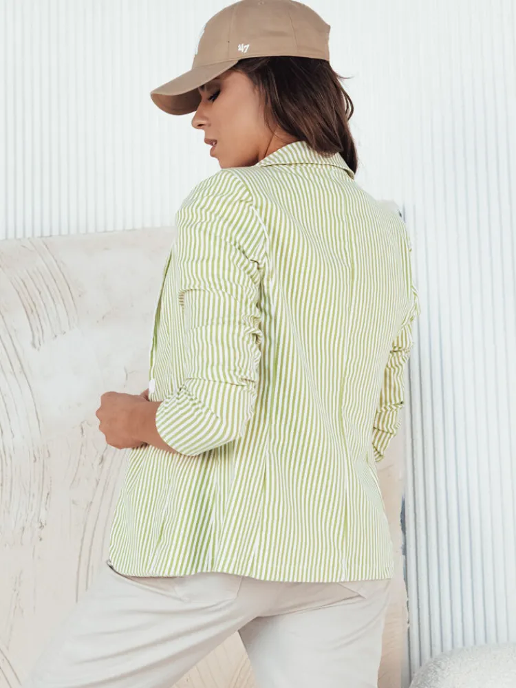 Ta stylowa marynarka w paski to doskonały wybór dla nowoczesnej kobiety. Zapięcie na jeden guzik i starannie wykończone kieszenie to połączenie funkcjonalności z modnym designem. Kołnierz nadaje jej klasycznego wyglądu, czyniąc ją idealnym uzupełnieniem zarówno formalnych, jak i nieformalnych strojów. Marynarka ta to must-have w garderobie każdej kobiety, która pragnie wyglądać elegancko z nutą nowoczesności.