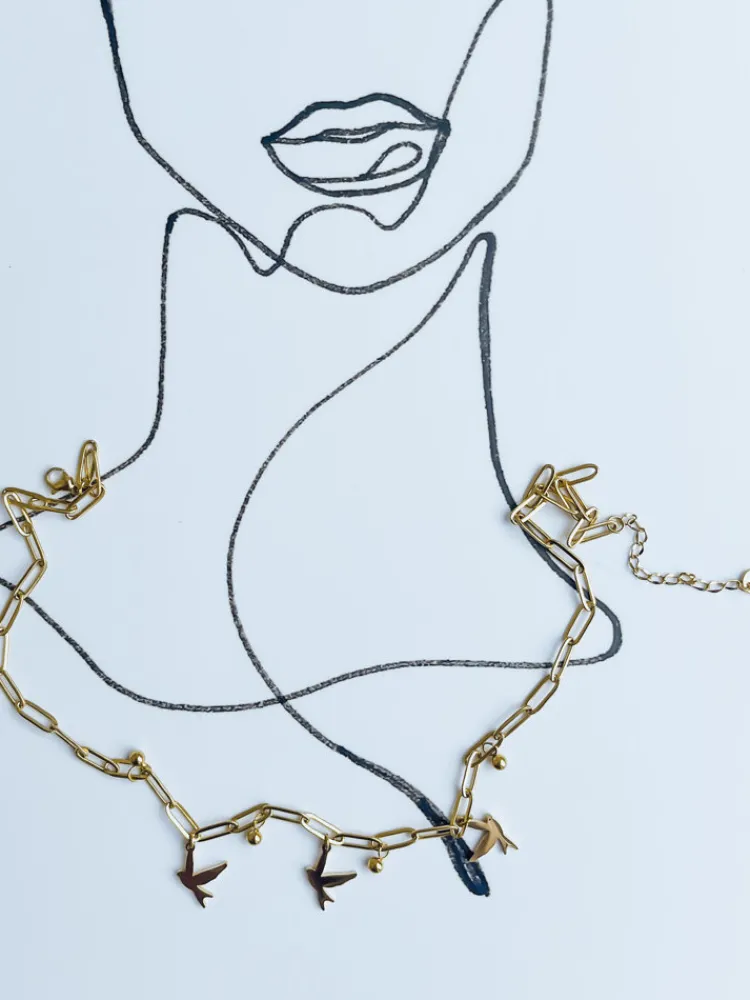 Efektownie wyglądająca propozycja o złotym kolorze, wykonana z łańcuszka o dużych oczkach. Całość urozmaicają zawieszki w kształcie jaskółek. Świetnie sprawdzi się jako prezent. Posiada zapinanie z możliwością regulacji długości.