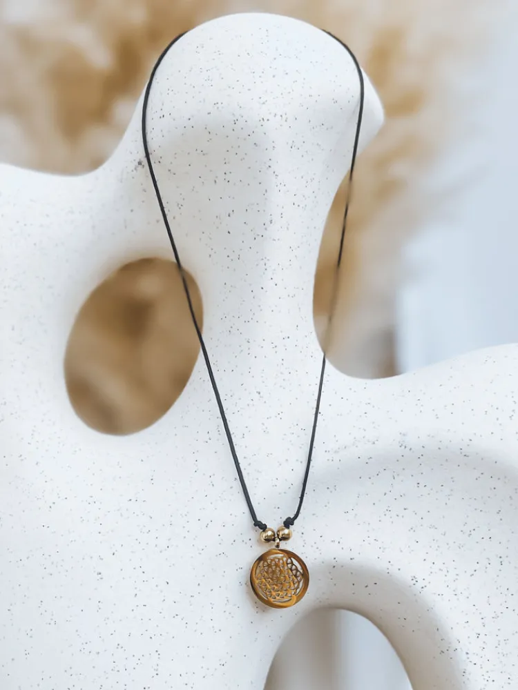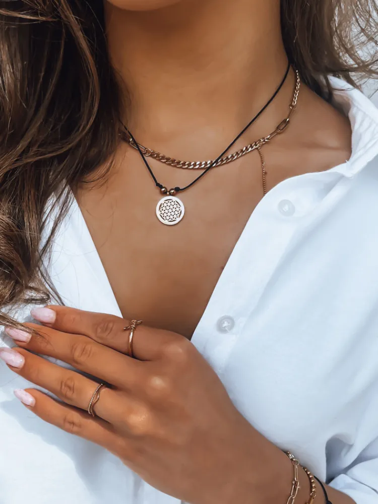 Naszyjnik JIMBIRIN to propozycja, która świetnie zaprezentuje się jako dopełnienie wielu stylizacji. Na czarnym sznureczku znajduje się ozdobna zawieszka w złotym kolorze. Zapinanie posiada możliwość regulacji.