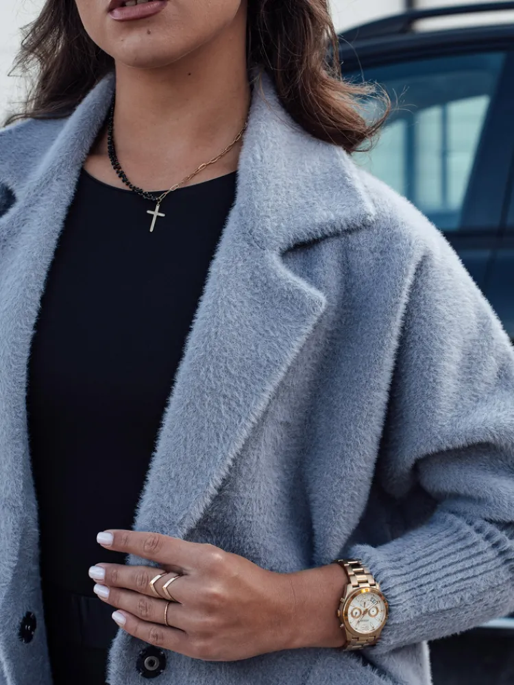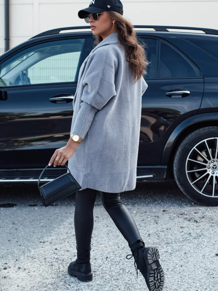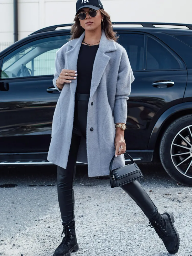 Płaszcz damski z alpaki RITA II to idealny wybór na chłodne dni. Wykonany z miękkiego i lekkiego materiału, zapewnia komfort oraz ciepło, jednocześnie nie obciążając sylwetki. Klasyczny krój z dużymi kieszeniami i wygodnym zapięciem sprawia, że płaszcz ten świetnie komponuje się z każdą stylizacją. Uniwersalny charakter sprawia, że pasuje zarówno do codziennych, jak i bardziej eleganckich zestawów.