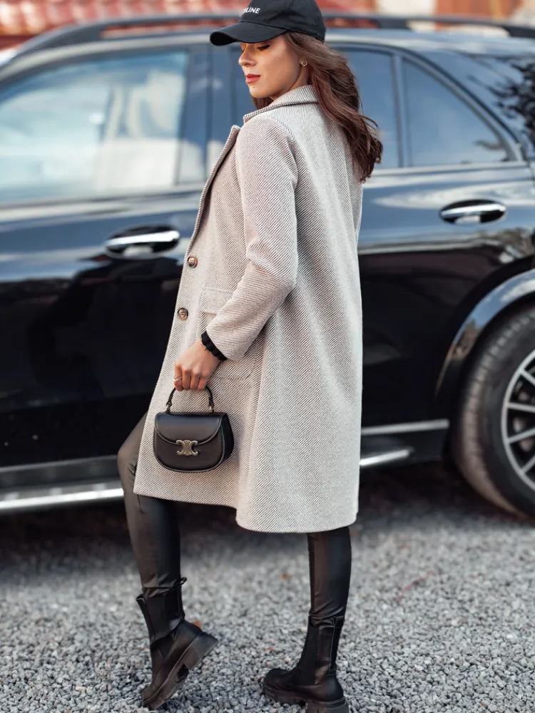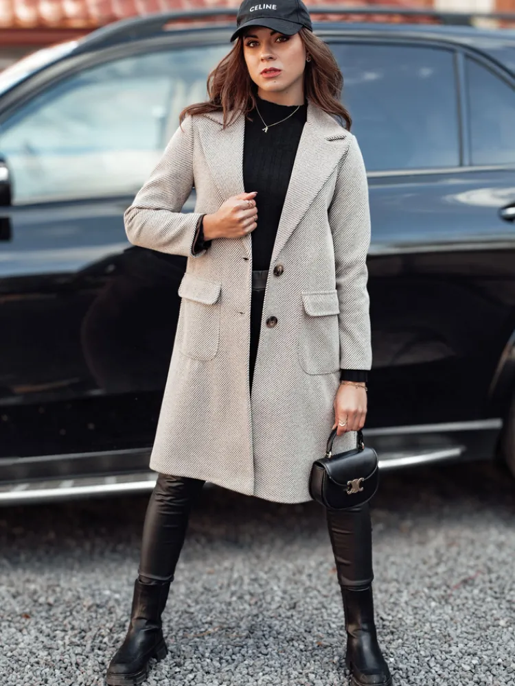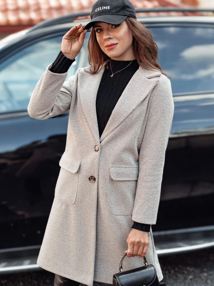 Elegancki płaszcz o prostym, klasycznym kroju, który świetnie komponuje się z różnymi stylizacjami. Wysokiej jakości tkanina zapewnia komfort noszenia, a stylowe detale dodają szyku. Idealny na chłodniejsze dni, zarówno na co dzień, jak i na specjalne okazje. Funkcjonalne kieszenie i dopasowany krój sprawiają, że jest to uniwersalny wybór dla każdej modnej kobiety. Doskonale wpisuje się w aktualne trendy.