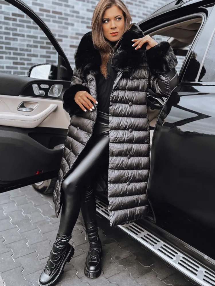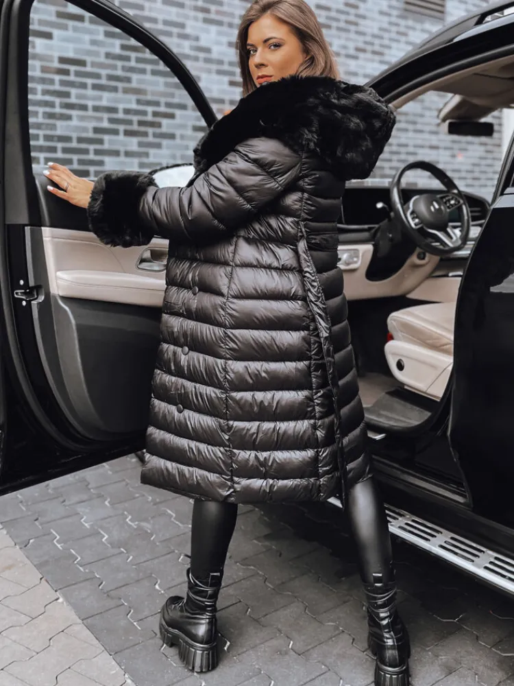 Pikowany płaszcz o dłuższym fasonie to niezbędnik w szafie każdej stylowej kobiety. Posiada efektownie wyglądający kołnierz z nieodpinanym futerkiem oraz rękawy również zakończone futerkiem, które można odpiąć. W pasie znajduje się pasek , którym można podkreślić talie, nadając całości eleganckiego wyglądu. Dodatkowy element ozdobny stanowi dwurzędowe zapinanie na guziki. Wypełniony został puchem syntetycznym, dzięki czemu jest ciepły i jednocześnie bardzo lekki. Idealnie dopełni wiele stylizacji.