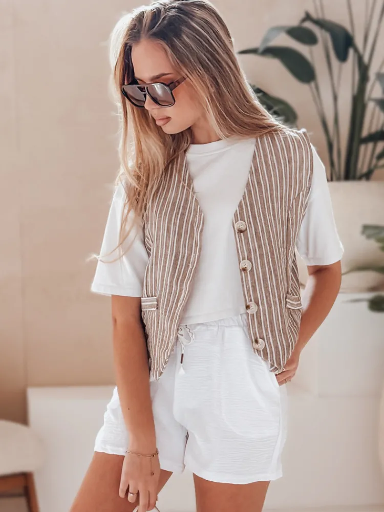 Spodenki damskie z materiału o delikatnej fakturze zachwycają prostotą i wakacyjnym klimatem. Wysoki stan oraz elastyczny pas gwarantują wygodę, a ozdobny sznurek dodaje całości oryginalnego charakteru. Uniwersalny fason świetnie komponuje się z topami, koszulami i sandałami. To model, który z łatwością można dopasować do codziennych stylizacji na lato.