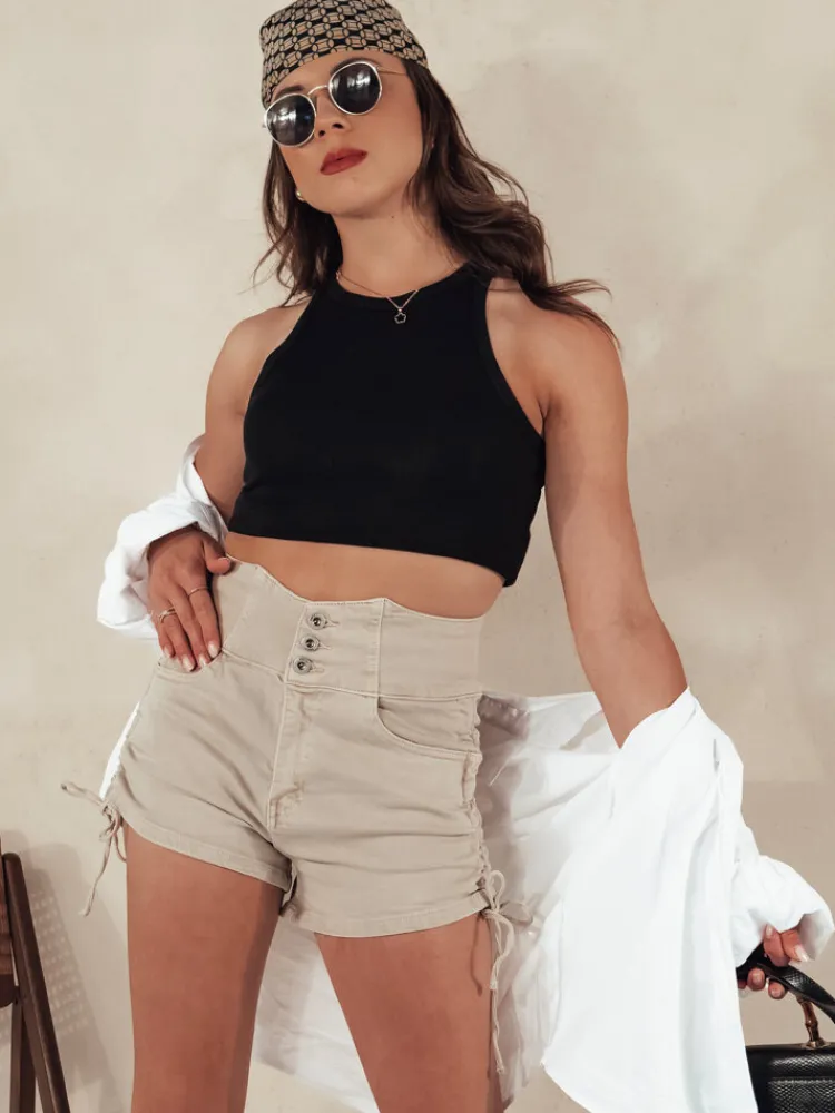 Stylowe spodenki STYLE SHORTS to idealny wybór na ciepłe dni. Wysoki stan z trzema ozdobnymi guzikami podkreśla talię, a boczne marszczenia dodają unikalnego charakteru. Doskonale sprawdzą się zarówno na co dzień, jak i na specjalne okazje. Wykonane z wysokiej jakości materiału, gwarantują komfort noszenia przez cały dzień. Spodenki łatwo zestawić z ulubioną koszulą czy topem, tworząc modny look. Skomponuj swoją stylizację i poczuj się wyjątkowo w tych wyjątkowych szortach.