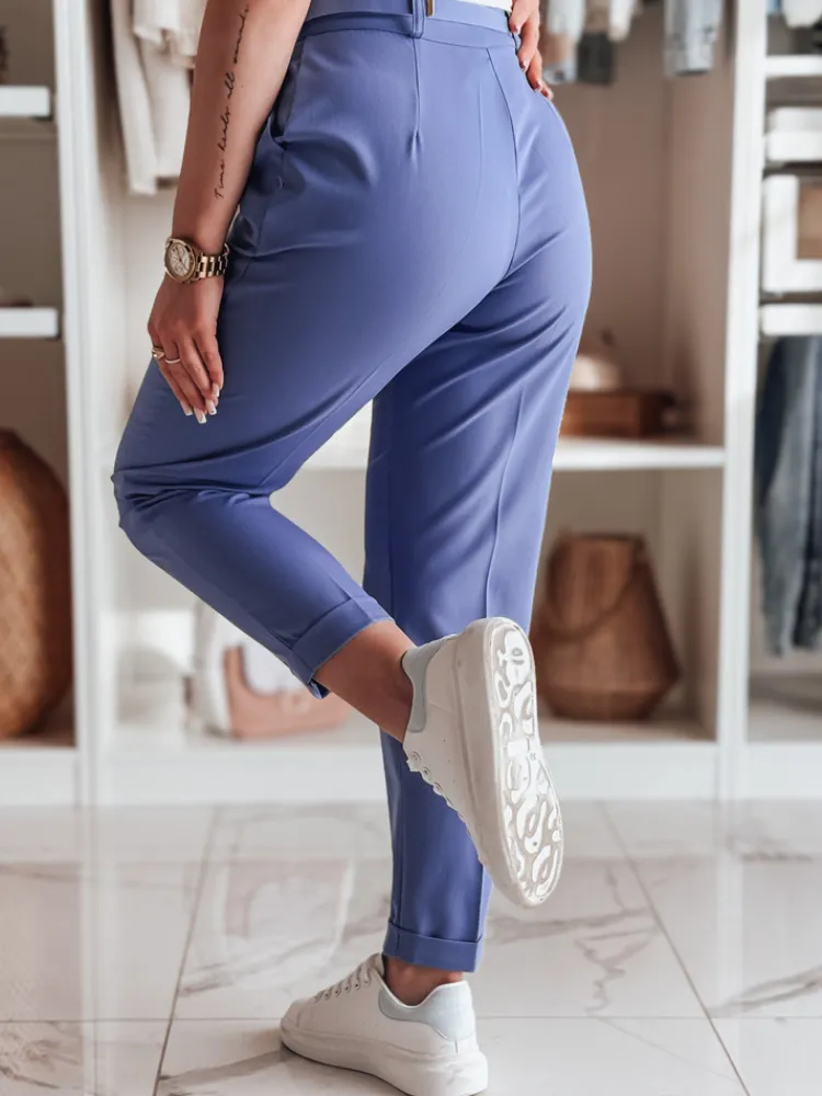 Klasyczne spodnie damskie w casualowym wydaniu. Wysoki stan i plisowania optycznie wysmuklają sylwetkę, a pasek w komplecie dopełnia całość. Zapinane na guzik i zamek, z kieszeniami dla większej wygody. Sprawdzą się zarówno w pracy, jak i podczas spotkań towarzyskich.