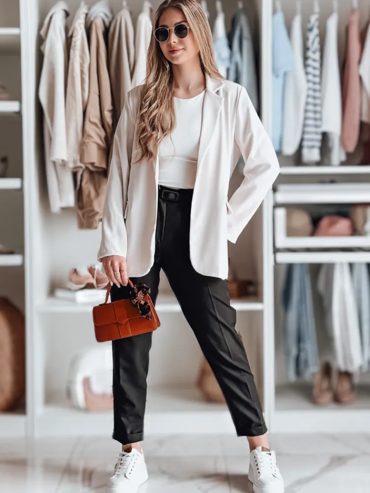 Klasyczne spodnie damskie w casualowym wydaniu. Wysoki stan i plisowania optycznie wysmuklają sylwetkę, a pasek w komplecie dopełnia całość. Zapinane na guzik i zamek, z kieszeniami dla większej wygody. Sprawdzą się zarówno w pracy, jak i podczas spotkań towarzyskich.