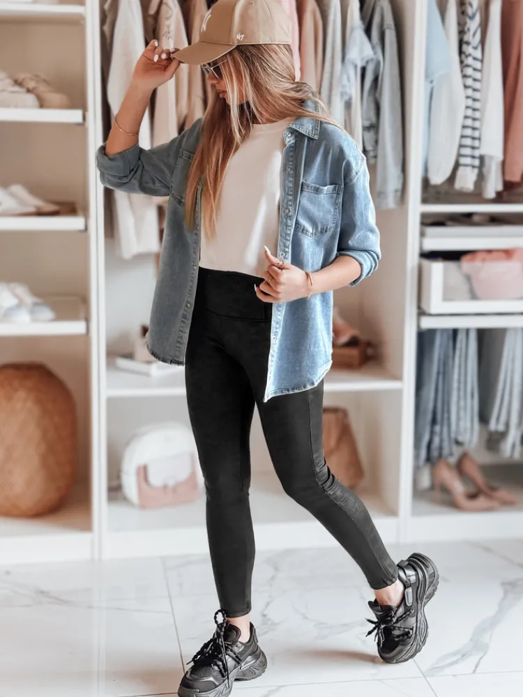 Klasyczne legginsy woskowane z wysokim stanem, które doskonale dopasowują się do sylwetki i modelują talię. Szeroka gumka w pasie podkreśla komfort noszenia, a struktura materiału dodaje im elegancji. Świetny wybór na codzienne i wieczorowe stylizacje – must-have dla fanek nowoczesnej mody!