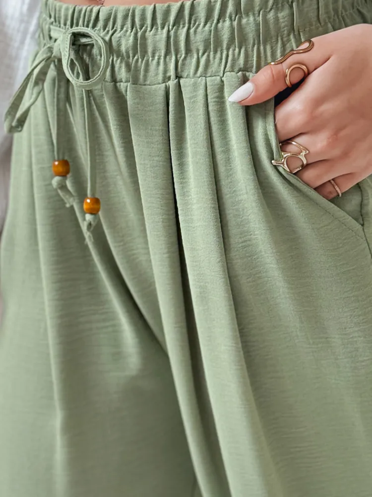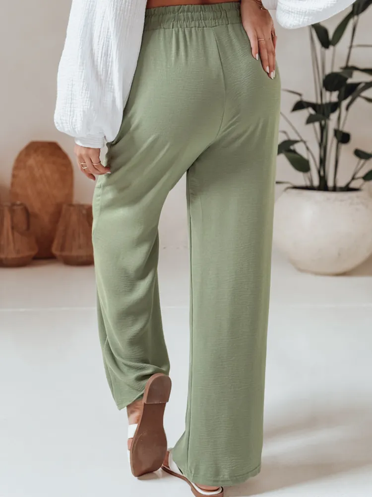 Materiałowe spodnie damskie o kroju wide leg to propozycja idealna na lato. Luźna nogawka i miękki materiał zapewniają wygodę, a elastyczna gumka oraz wiązanie w pasie gwarantują idealne dopasowanie. Ozdobne kieszenie z przodu dodają całości casualowego stylu. Świetnie sprawdzą się podczas wakacyjnych wyjazdów, jak i ciepłe dni wiosny.