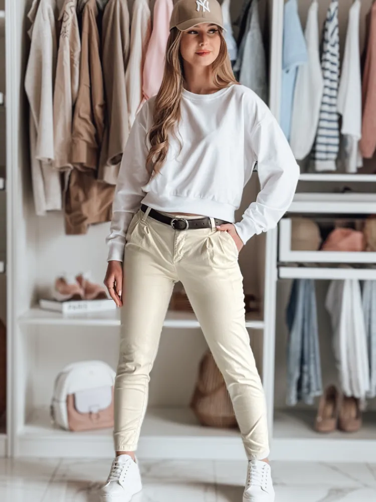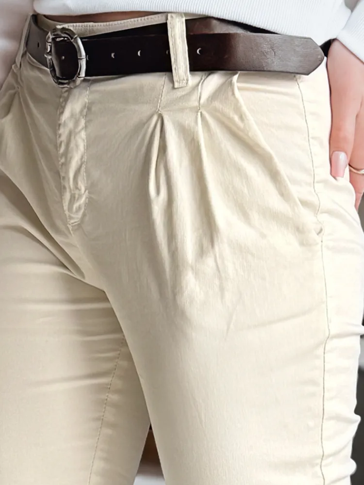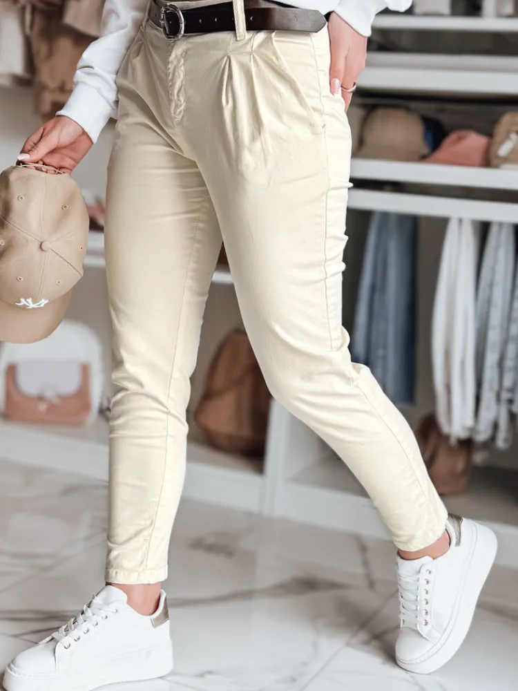 Eleganckie spodnie chinosy materiałowe o dopasowanym kroju, idealne do casualowych i bardziej formalnych stylizacji. Posiadają średni stan oraz ozdobne kieszenie z przodu. Pasek w zestawie podkreśla talię i dodaje wyrazistości. Zapięcie na guzik i zamek gwarantuje komfort noszenia. Świetnie komponują się z koszulą i sneakersami, tworząc modny, miejski look.