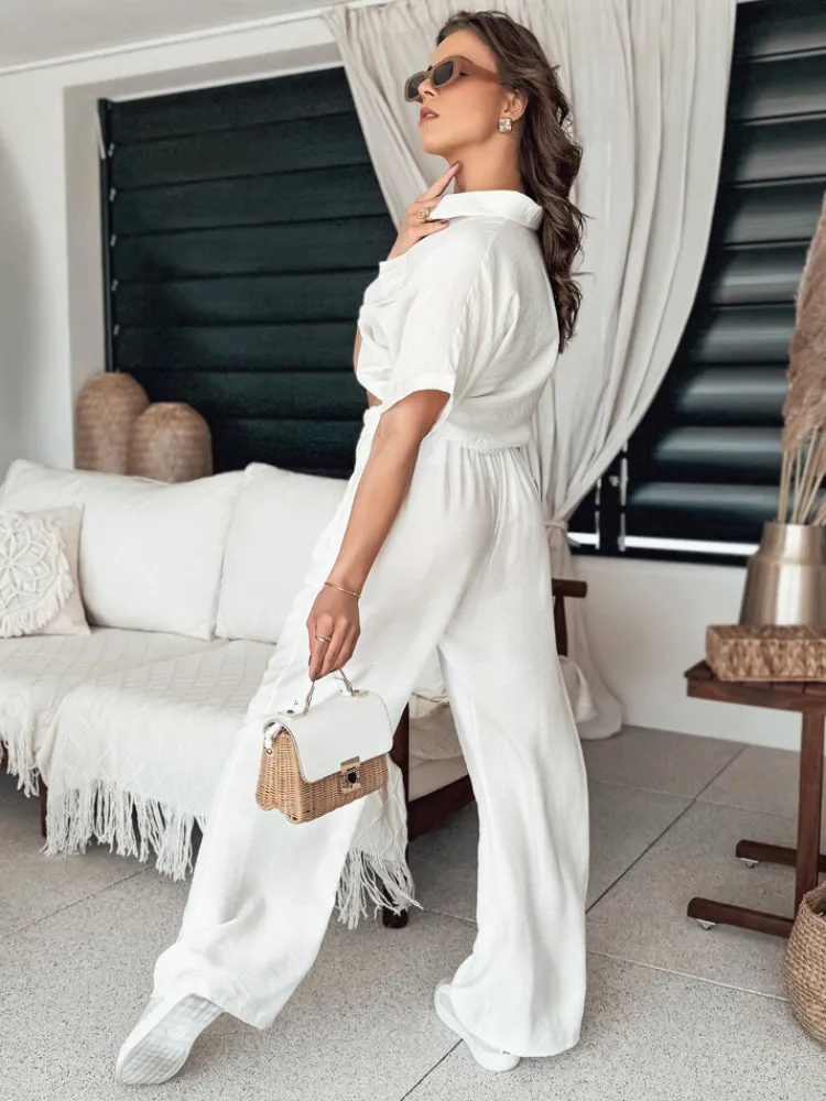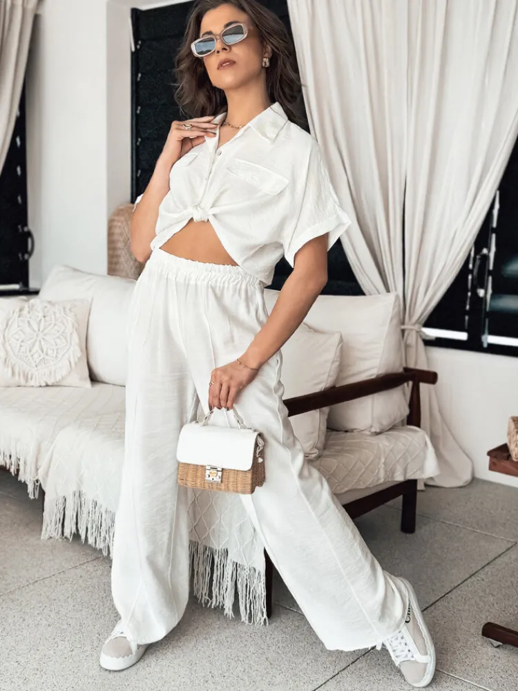 Spodnie dzwony GRITAN to must-have sezonu dla każdej miłośniczki modowych nowinek. Ich elastyczny pas zapewnia idealne dopasowanie, a lejący kształt dzwonów dodaje lekkości kroku. W połączeniu z koszulą GRITAN tworzą zestaw, który przyciąga uwagę, podkreślając indywidualny styl i pewność siebie.