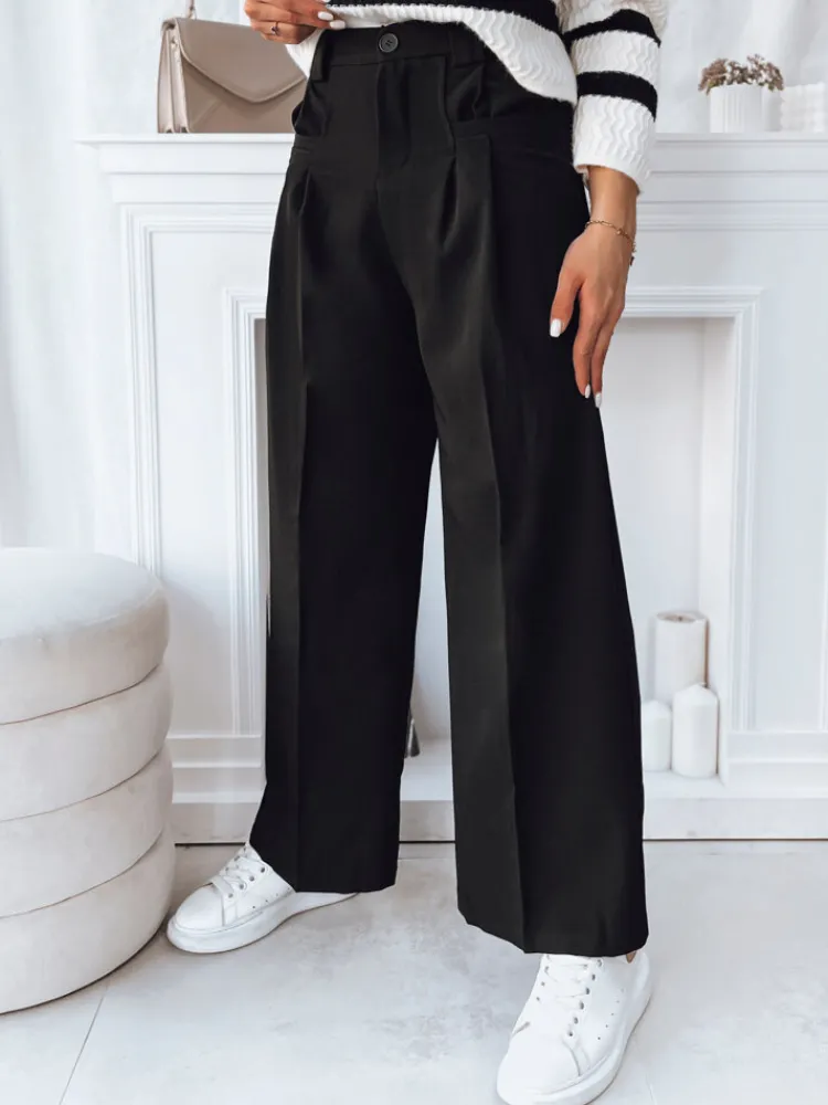Materiałowe spodnie o kroju wide leg to perfekcyjny wybór zarówno do codziennych, jak i eleganckich stylizacji. Posiadają wysoki stan oraz długą, szeroką nogawkę. Model ten zapinany jest na guzik i suwak. Posiada dwie kieszenie. Dostępne w dwóch kolorach.