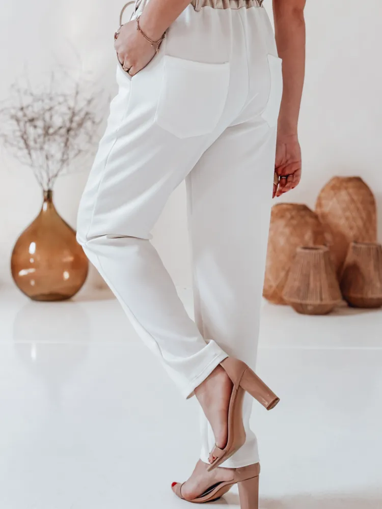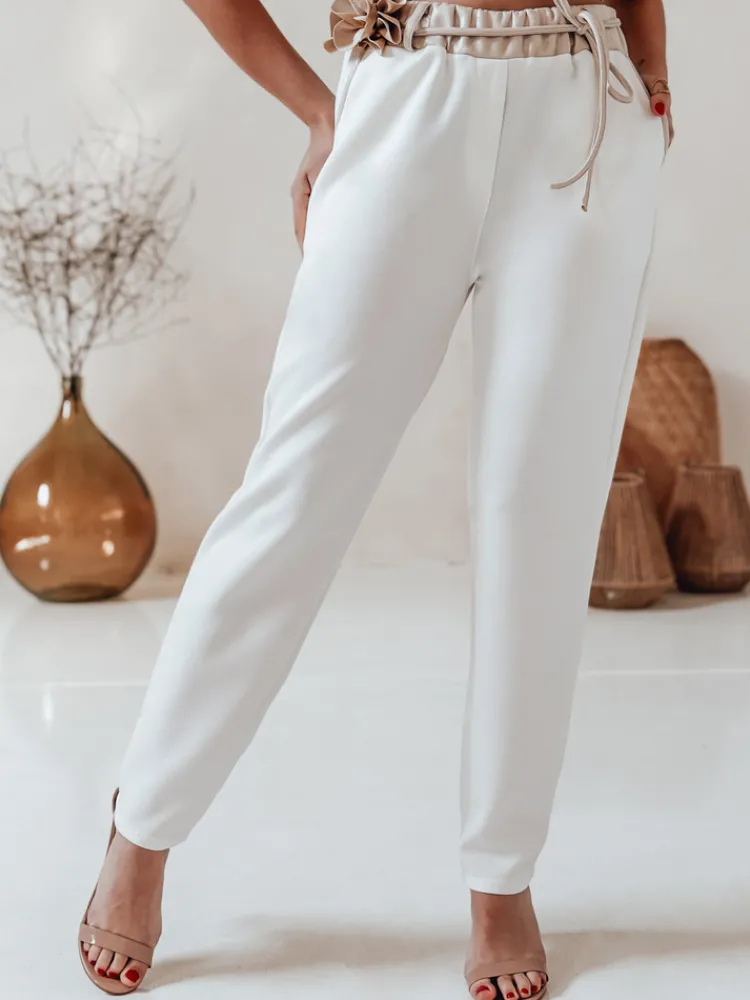Spodnie damskie casualowe masełko z prostą nogawką to połączenie wygody i elegancji. Gumka w pasie zapewnia komfort noszenia, a ozdobny sznurek z kwiatami dodaje unikalnego charakteru. Klasyczne kieszenie podkreślają urok, a podwyższony stan pięknie modeluje sylwetkę. Idealne na codzienne stylizacje.