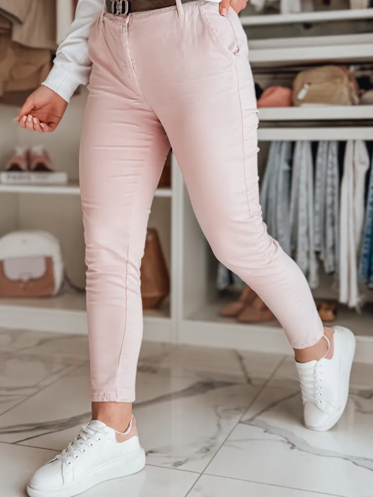 Damskie spodnie materiałowe o kroju slim fit, które doskonale podkreślają sylwetkę oraz optycznie wyszczuplają nogi. Model zapinany na guzik i zamek, wyposażony w dwie kieszenie z przodu oraz ozdobne kieszenie z tyłu. Średni stan zapewnia wygodę, a dołączony pasek dodaje stylowego akcentu. Idealne do codziennych i eleganckich stylizacji.