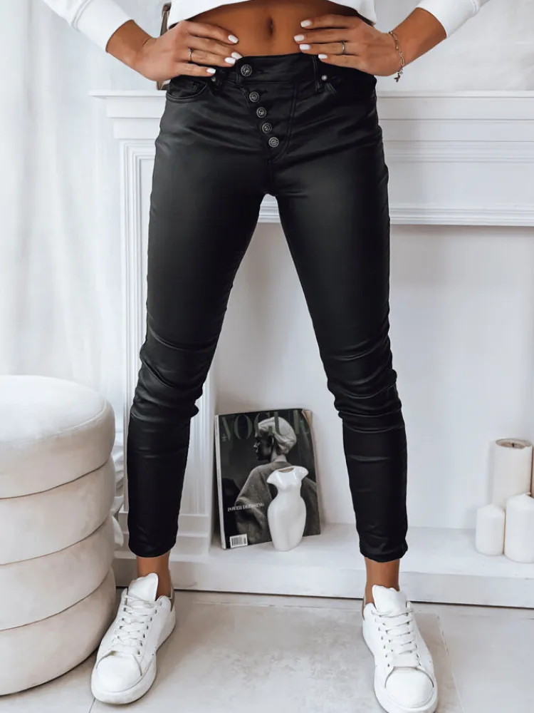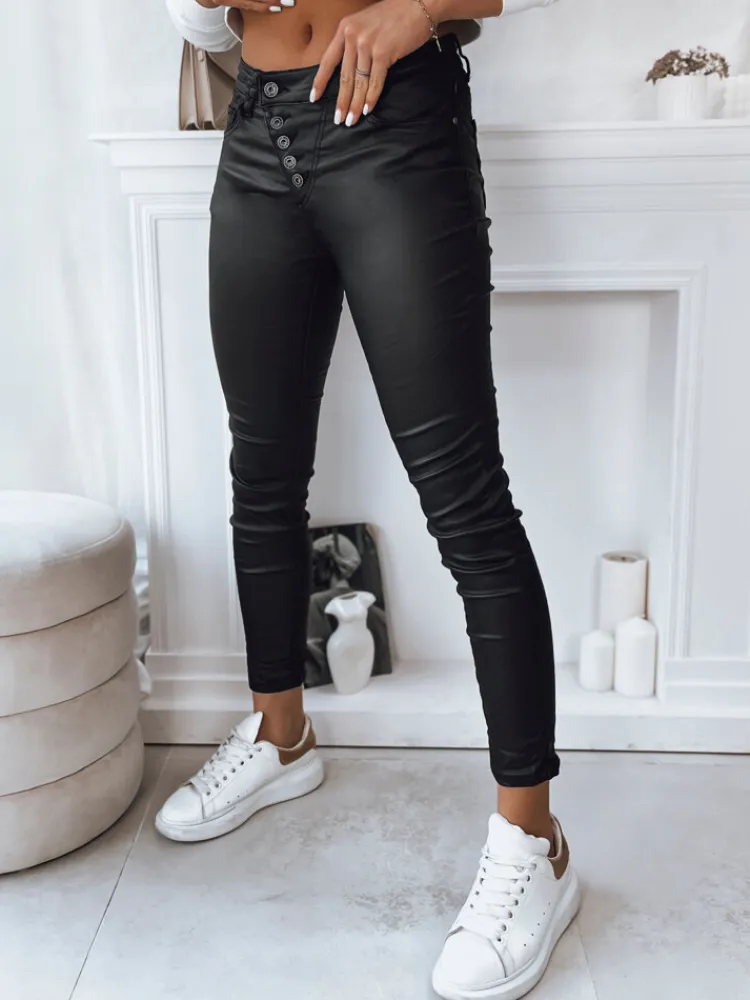 Dopasowane spodnie woskowane podkreślają sylwetkę, a jednocześnie zapewniają wygodę noszenia. Dwie kieszenie dodają praktyczności, umożliwiając przechowywanie niezbędnych przedmiotów. Całości uroku nadają praktyczne i jednocześnie ozdobne guziki zapinane na skos.