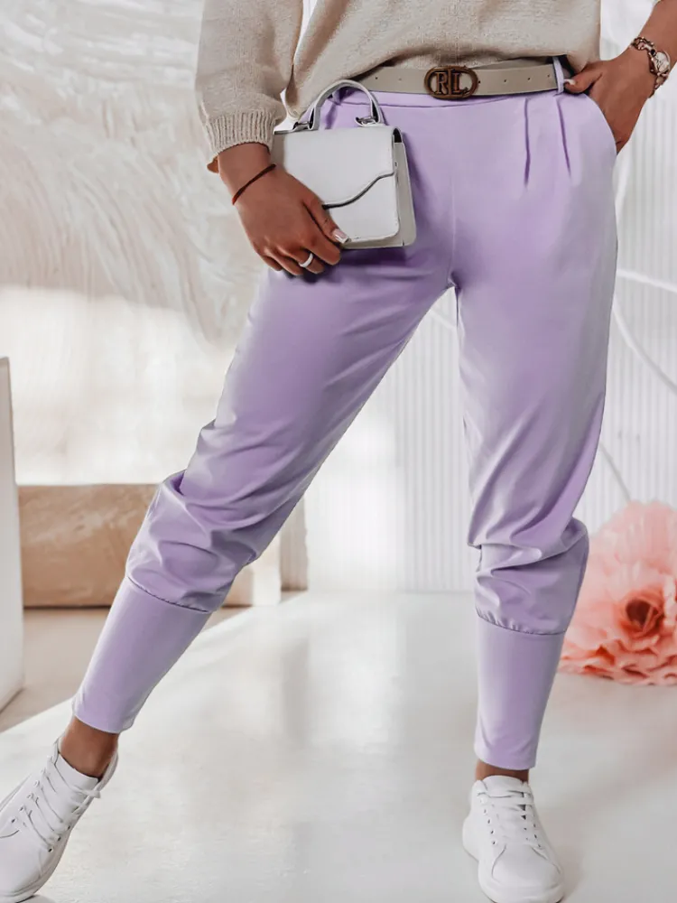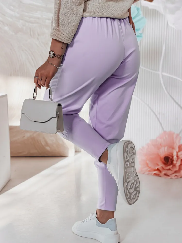 Damskie spodnie materiałowe o klasycznym fasonie, które łączą elegancję i wygodę. Posiadają elastyczną gumkę w pasie oraz zwężane nogawki zakończone ściągaczem, co zapewnia doskonałe dopasowanie. Uniwersalny rozmiar pasuje od XS do L. W zestawie znajduje się pasek podkreślający talię. Idealne do casualowych i bardziej eleganckich stylizacji.