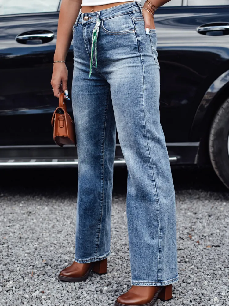 Stylowe dżinsy z wysokim stanem, które doskonale podkreślają sylwetkę. Idealnie dopasowane i komfortowe, sprawdzą się w wielu codziennych stylizacjach. Wysoka jakość wykonania gwarantuje wygodę noszenia przez cały dzień, a nowoczesny krój doda każdej stylizacji modowego wyrafinowania. Doskonałe na każdą porę roku, pasują zarówno do casualowych, jak i bardziej eleganckich zestawów.