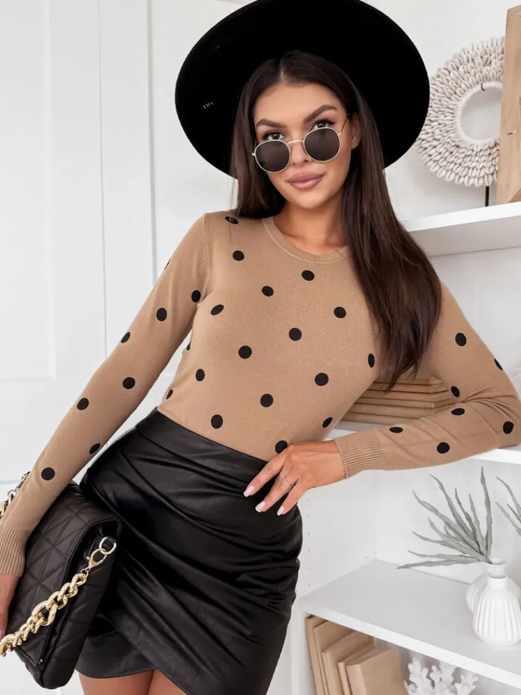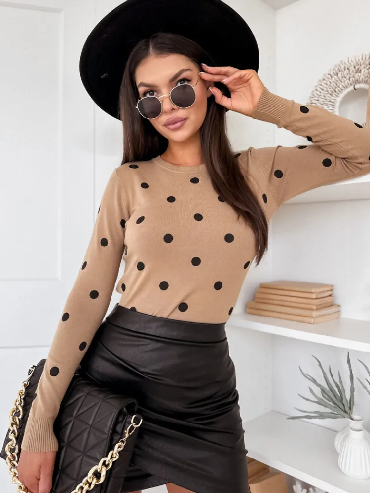 - Wyjątkowy Wzór: Sweter ATHENA wyróżnia się oryginalnym i uroczym wzorem kropek, nadając każdej stylizacji subtelnego i dziewczęcego wdzięku.