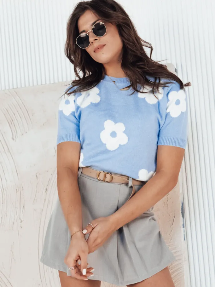 Podkreśl swój styl i kobiecość dzięki temu eleganckiemu, dzianinowemu swetrowi z krótkimi rękawami. Niezależnie od okazji, subtelny wzór kwiatów na swetrze doda Twojemu wizerunkowi lekkości i świeżości. Ten sweter jest doskonałym wyborem dla kobiet, które cenią sobie klasykę z odrobiną nowoczesnego akcentu.