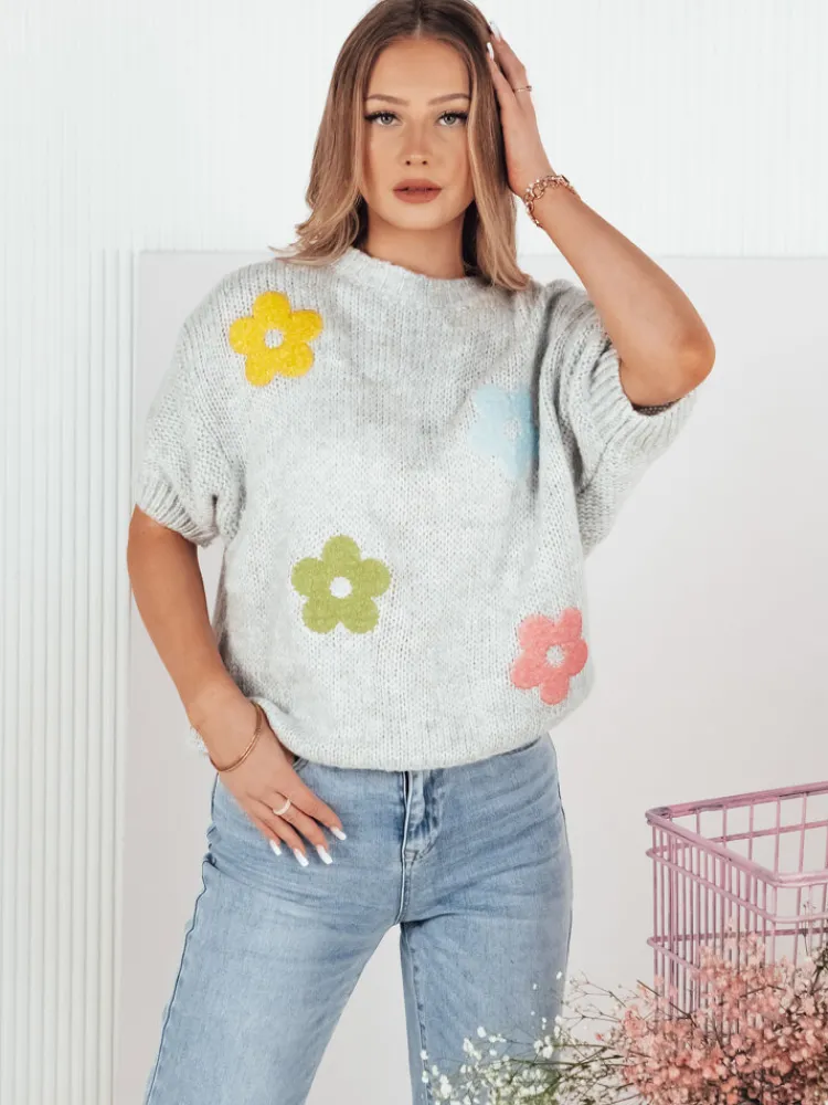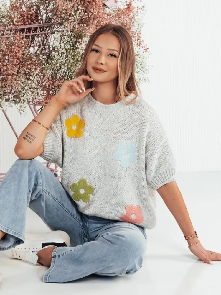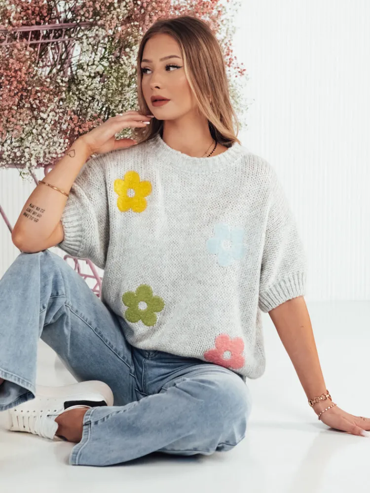 Wyróżnij się w tłumie dzięki naszemu swetrowi z półdługim rękawem, który łączy w sobie prążkowany materiał i elegancki kwiecisty motyw z luźnym krojem dla nowoczesnego wyglądu i komfortu.