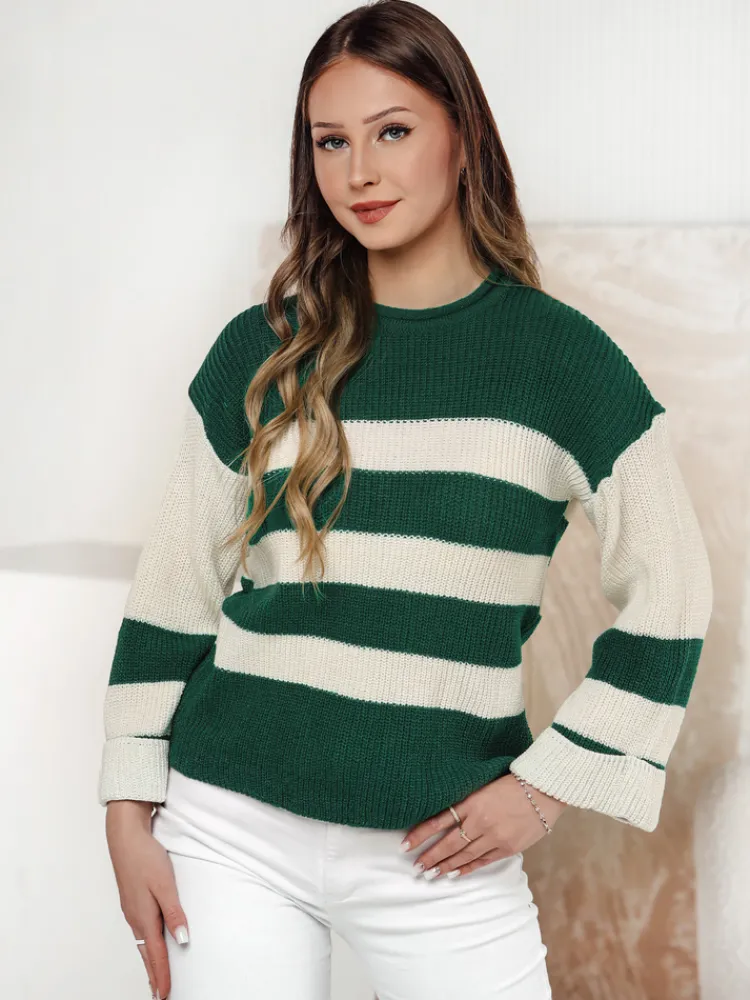 Stylowy sweter z szerokimi rękawami, który przyciąga uwagę klasycznym wzorem w paski. Miękki i przyjemny w dotyku materiał zapewnia wygodę, a luźny krój idealnie nadaje się do codziennych stylizacji. To połączenie komfortu z modnym wyglądem, które sprawdzi się na każdą okazję.