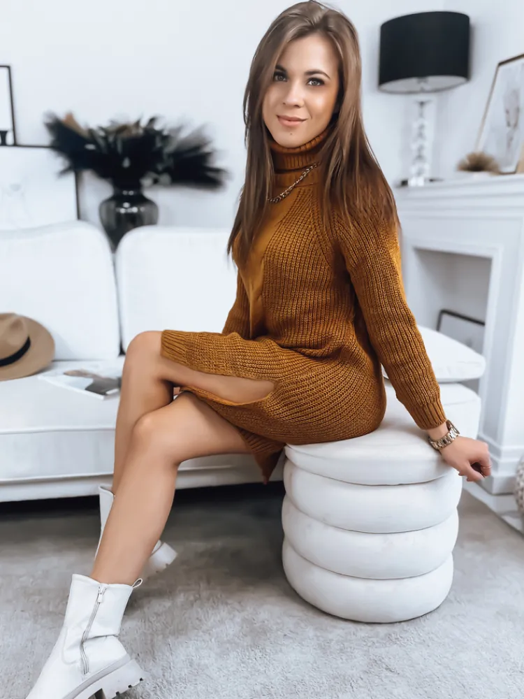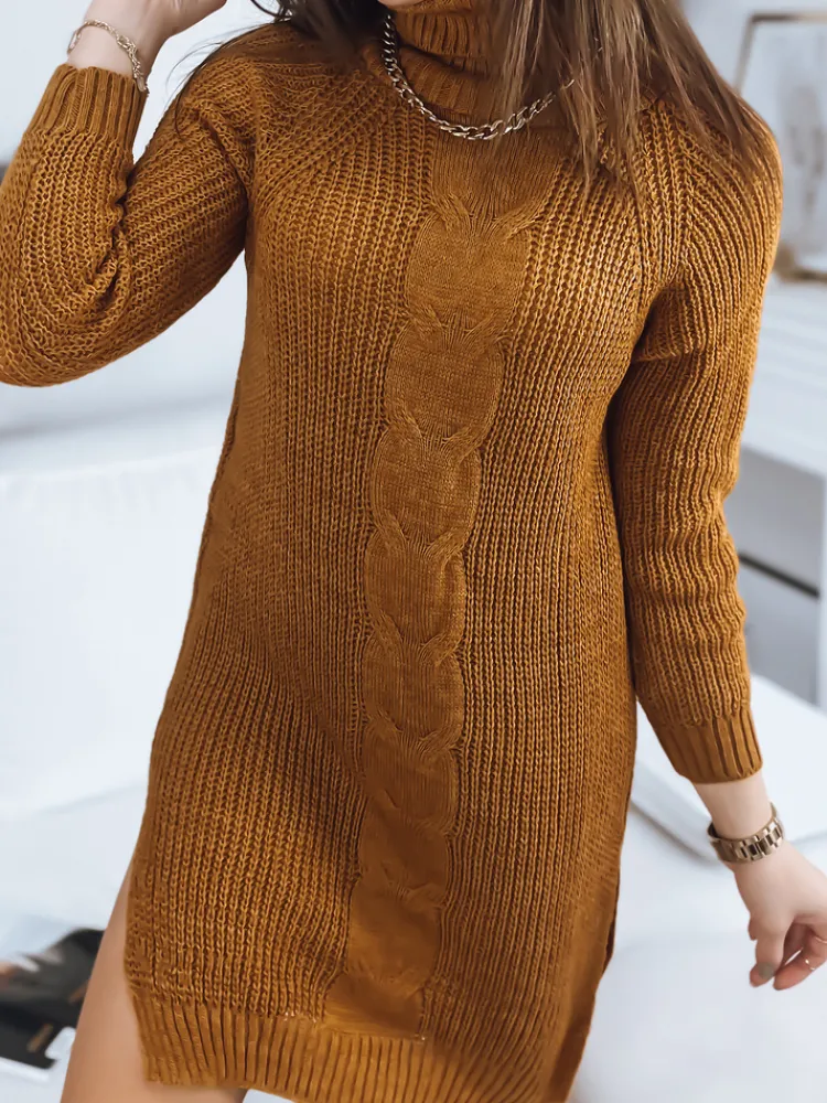 Ten model to idealna propozycja na jesienno-zimowe stylizacje. Fason z golfem świetnie dopasowuje się do sylwetki. Przez całą długość sweterka przechodzą ozdobne przeszycia. Sweter będzie idealnie pasował zarówno do spodni, jak i do rajstop pełniąc funkcję sukienki. Model po bokach posiada ozdobne rozcięcia.
